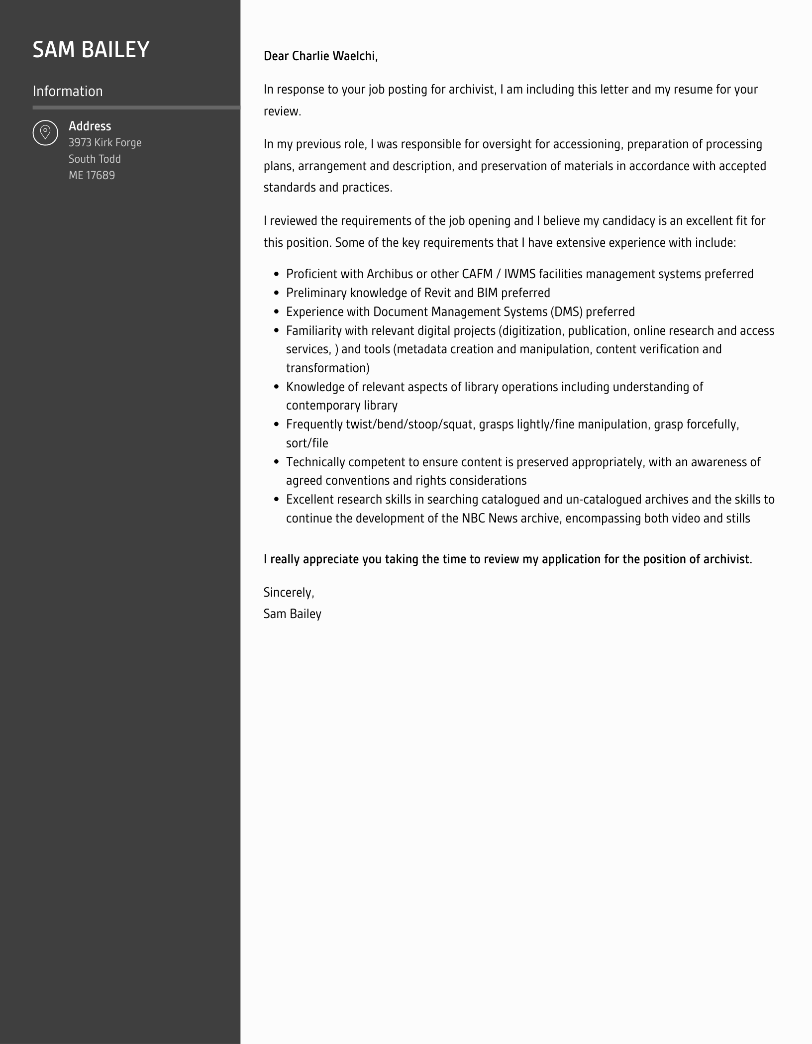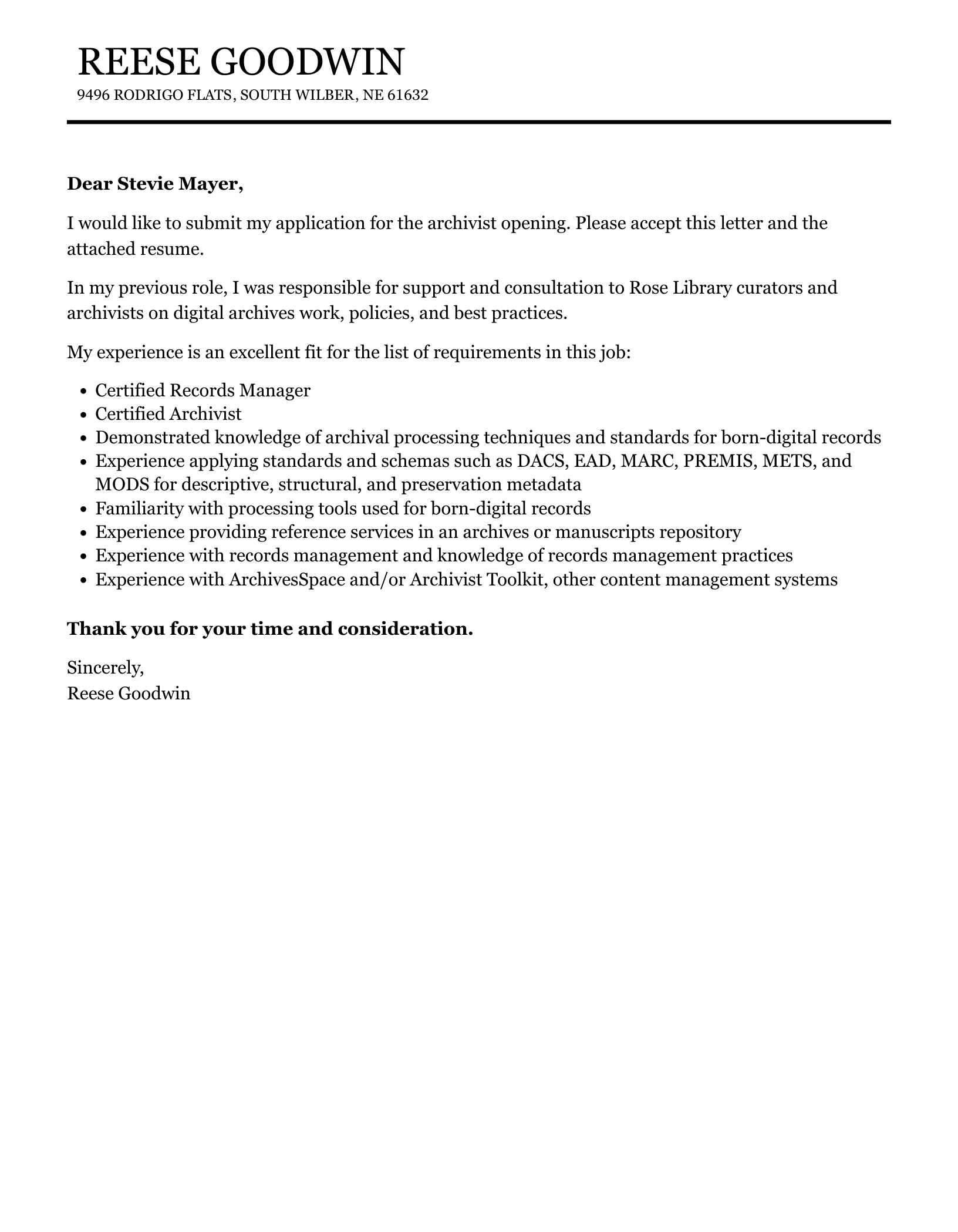 I am excited to be applying for the position of archivist. Please accept this letter and the attached resume as my interest in this position.