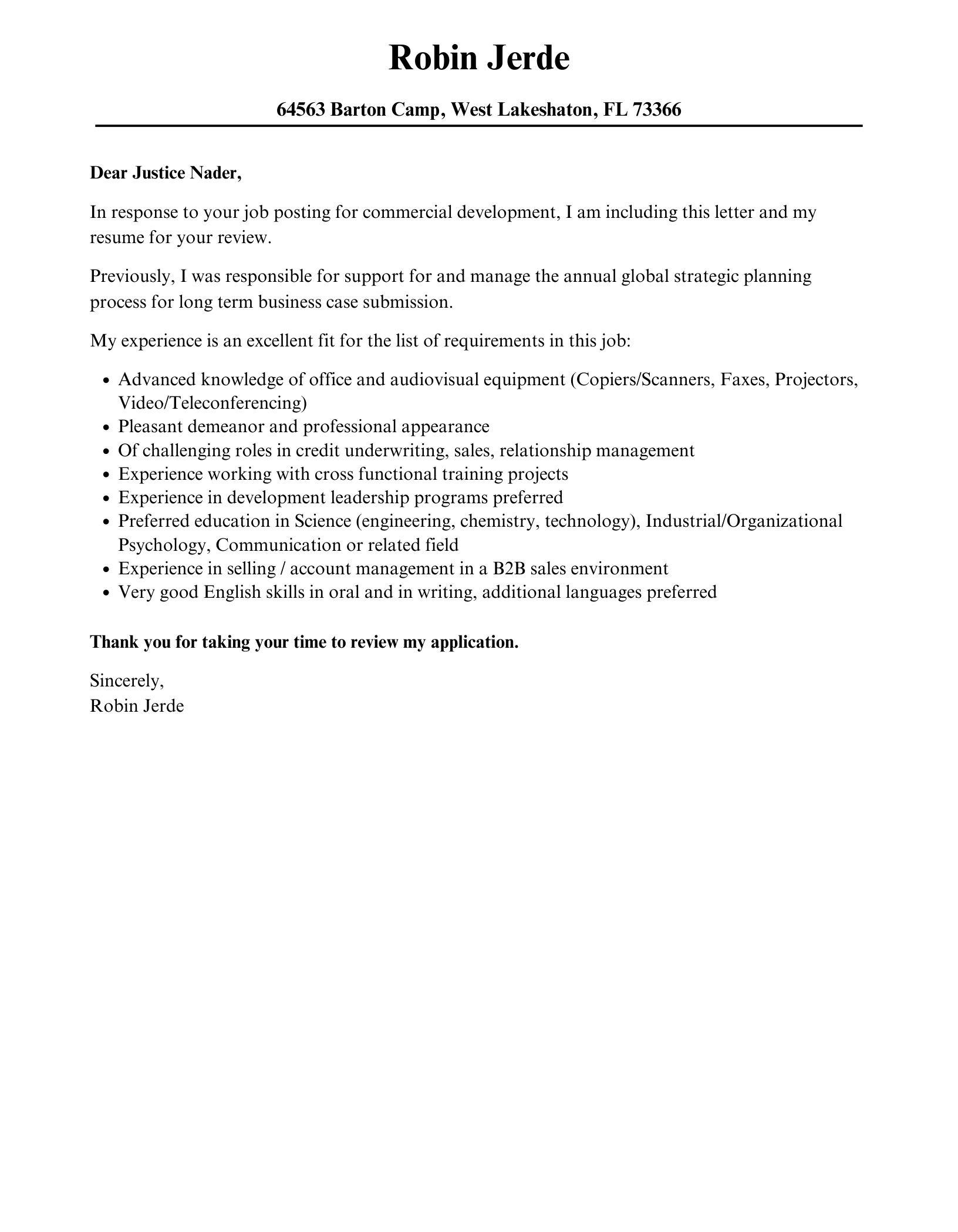 Example of Commercial Development Cover Letter