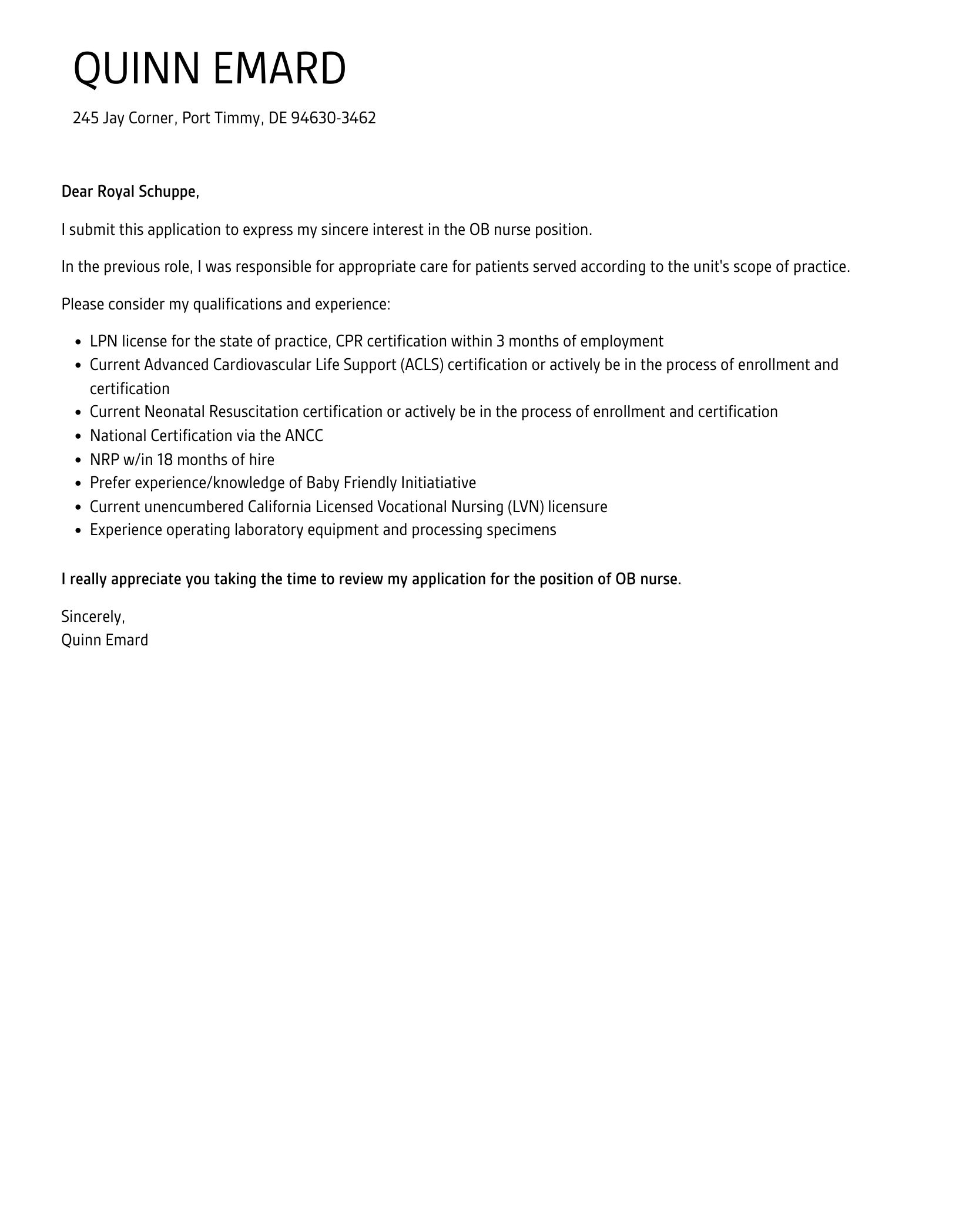 I am excited to be applying for the position of OB nurse. Please accept this letter and the attached resume as my interest in this position.