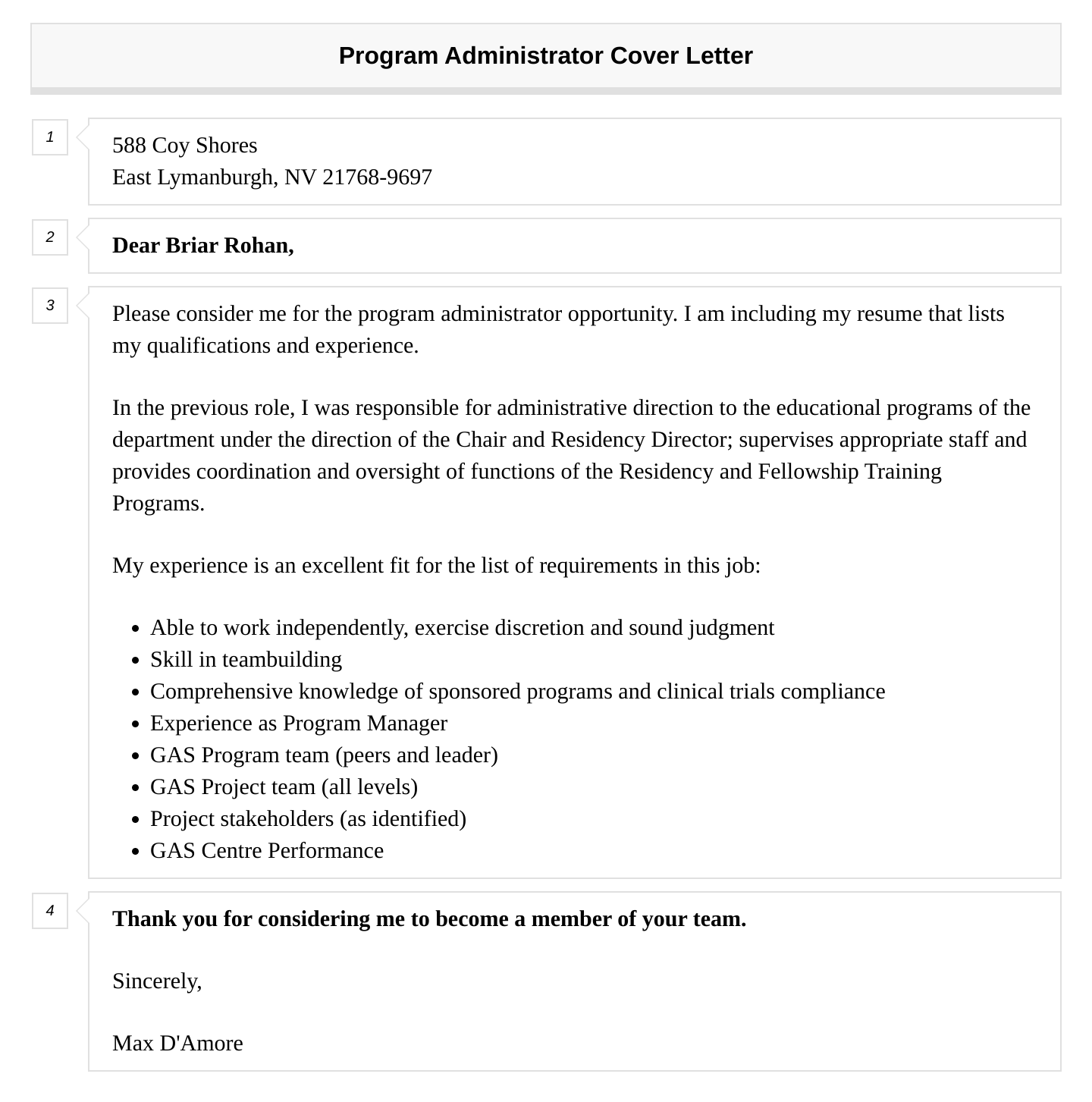 Please consider me for the program administrator opportunity. I am including my resume that lists my qualifications and experience.