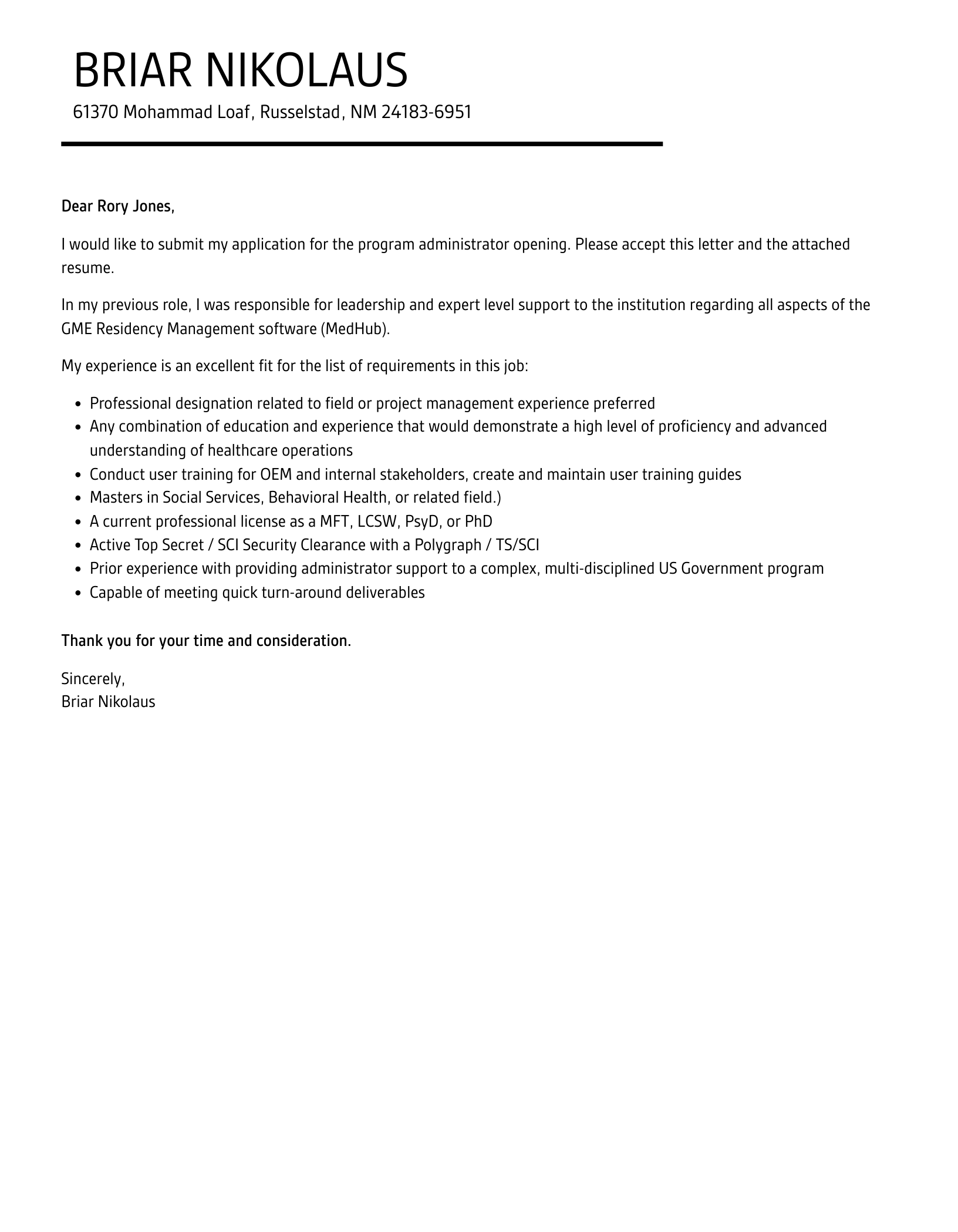 I am excited to be applying for the position of program administrator. Please accept this letter and the attached resume as my interest in this position.