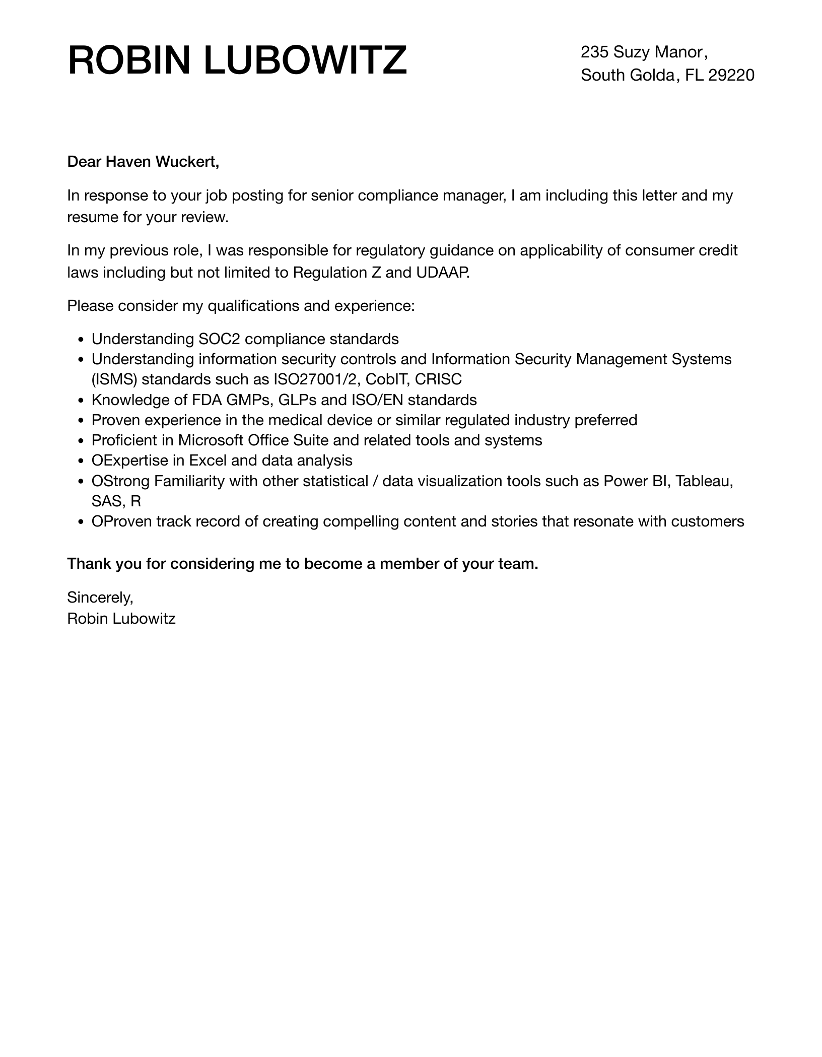 In response to your job posting for senior compliance manager, I am including this letter and my resume for your review.