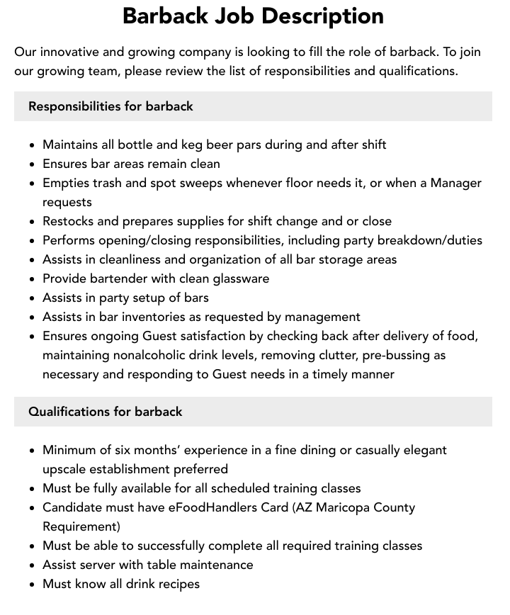 To write an effective barback job description, begin by listing detailed duties, responsibilities and expectations. We have included barback job description templates that you can modify and use.