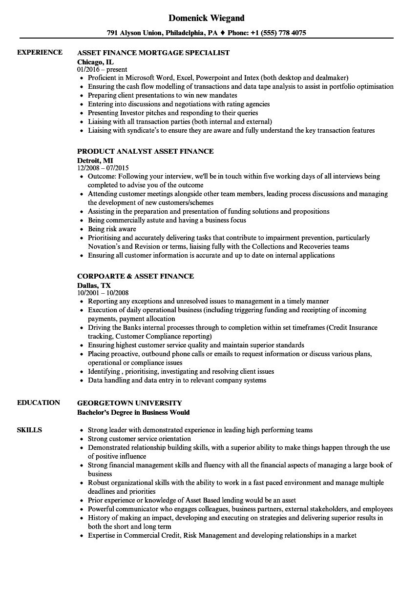 Asset Finance Mortgage Specialist Resume Examples & Samples