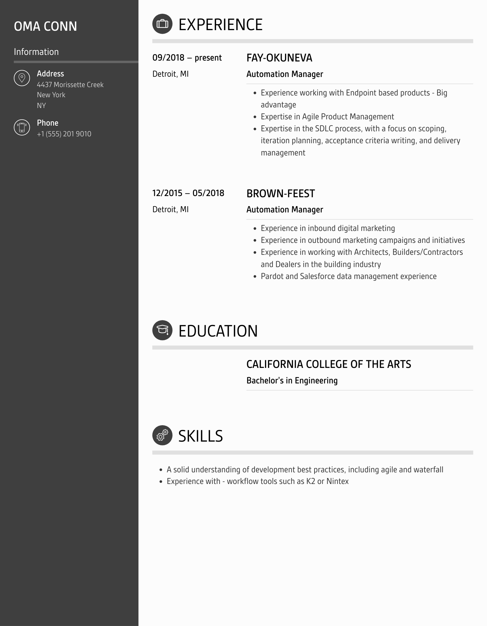 Guide the recruiter to the conclusion that you are the best candidate for the automation manager job. It’s actually very simple. Tailor your resume by picking relevant responsibilities from the examples below and then add your accomplishments. This way, you can position yourself in the best way to get hired.