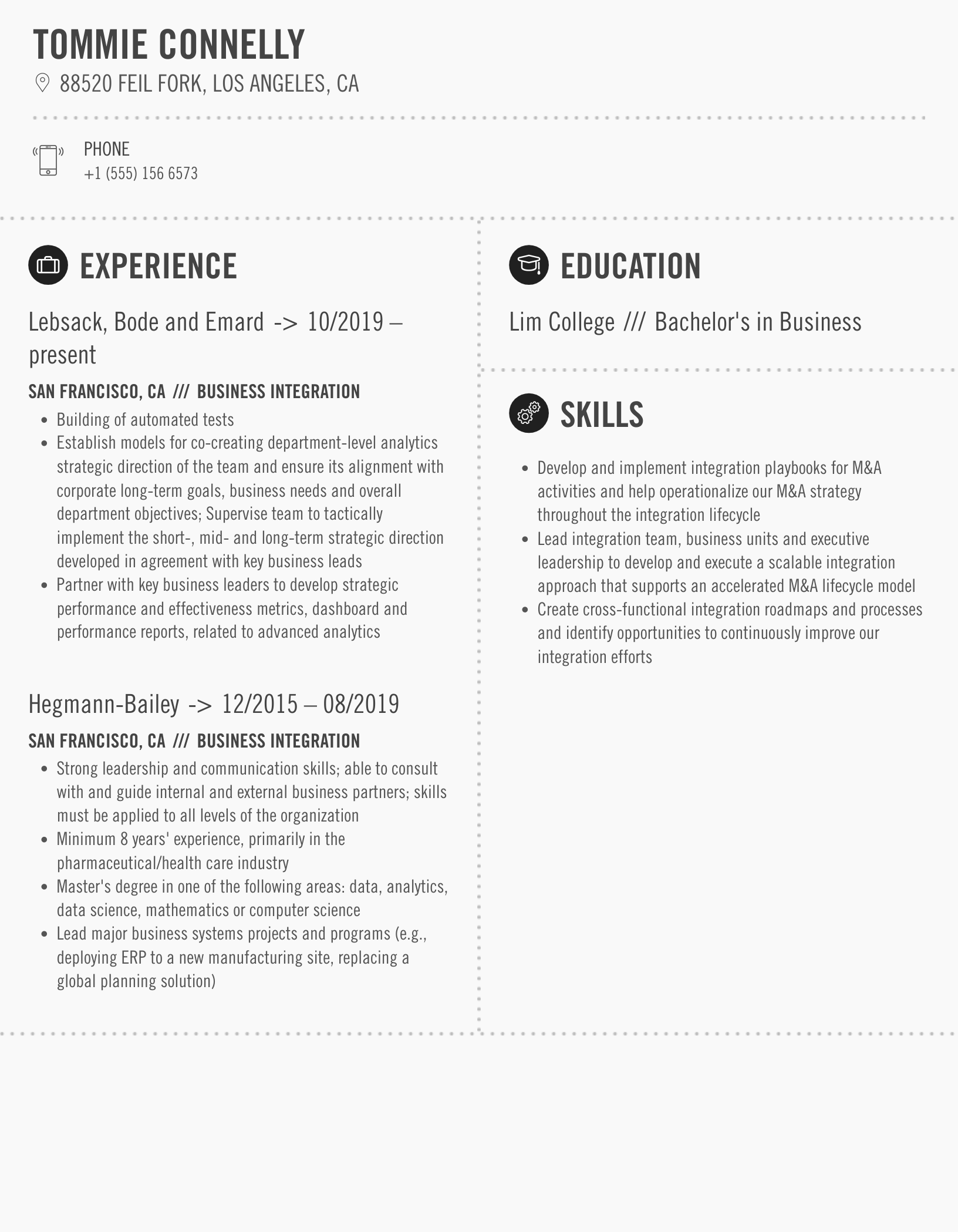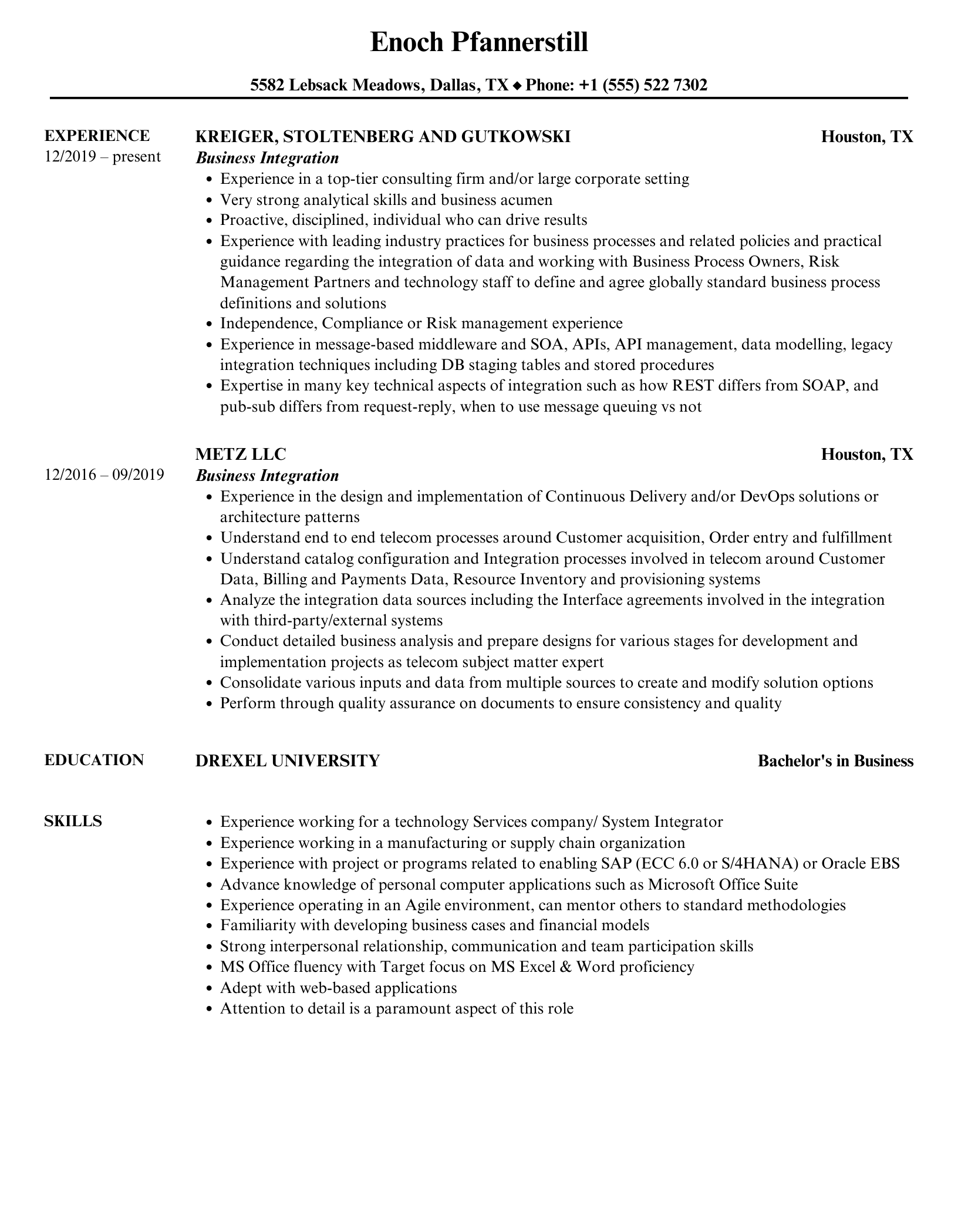 Guide the recruiter to the conclusion that you are the best candidate for the business integration job. It’s actually very simple. Tailor your resume by picking relevant responsibilities from the examples below and then add your accomplishments. This way, you can position yourself in the best way to get hired.