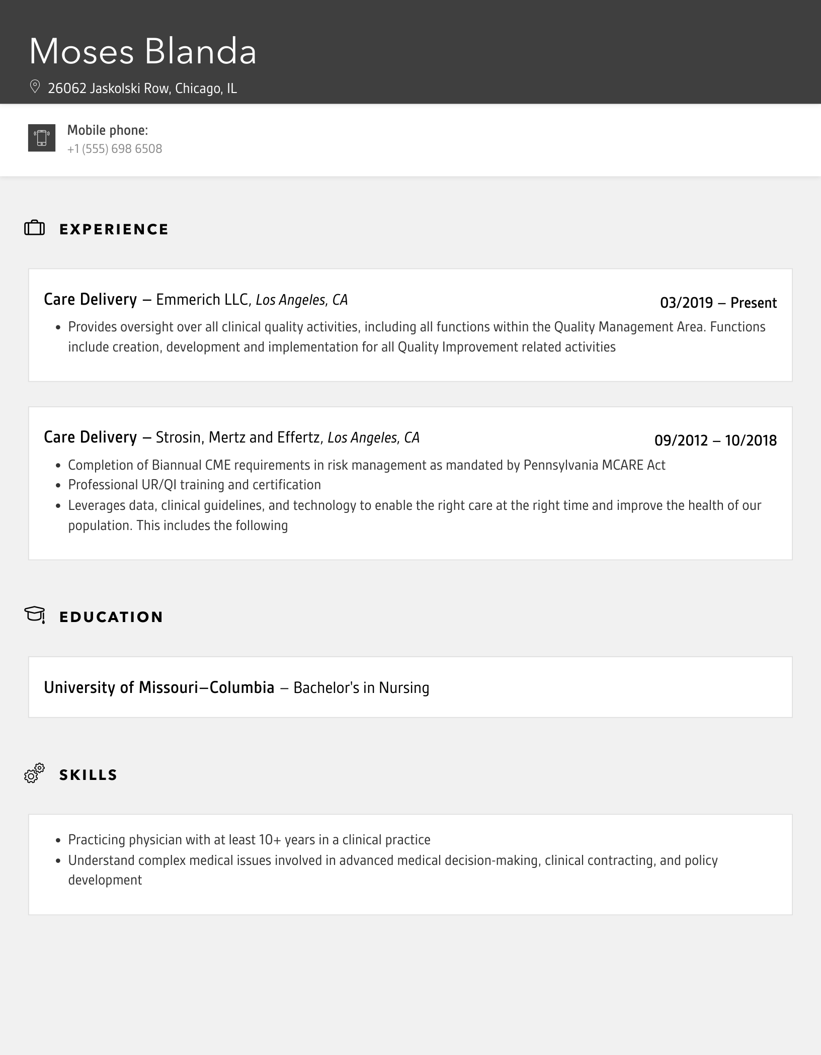 Guide the recruiter to the conclusion that you are the best candidate for the care delivery job. It’s actually very simple. Tailor your resume by picking relevant responsibilities from the examples below and then add your accomplishments. This way, you can position yourself in the best way to get hired.