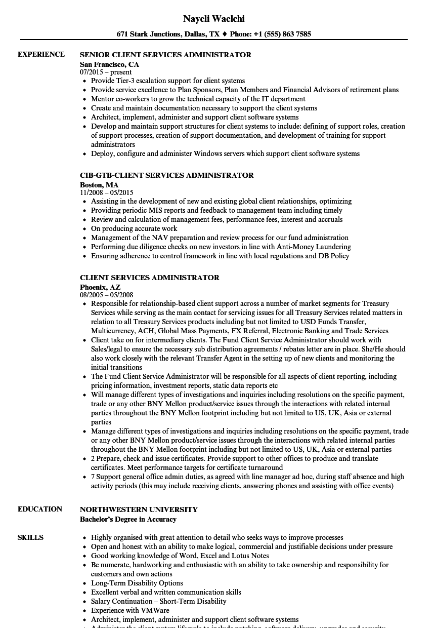 Guide the recruiter to the conclusion that you are the best candidate for the client services administrator job. It’s actually very simple. Tailor your resume by picking relevant responsibilities from the examples below and then add your accomplishments. This way, you can position yourself in the best way to get hired.