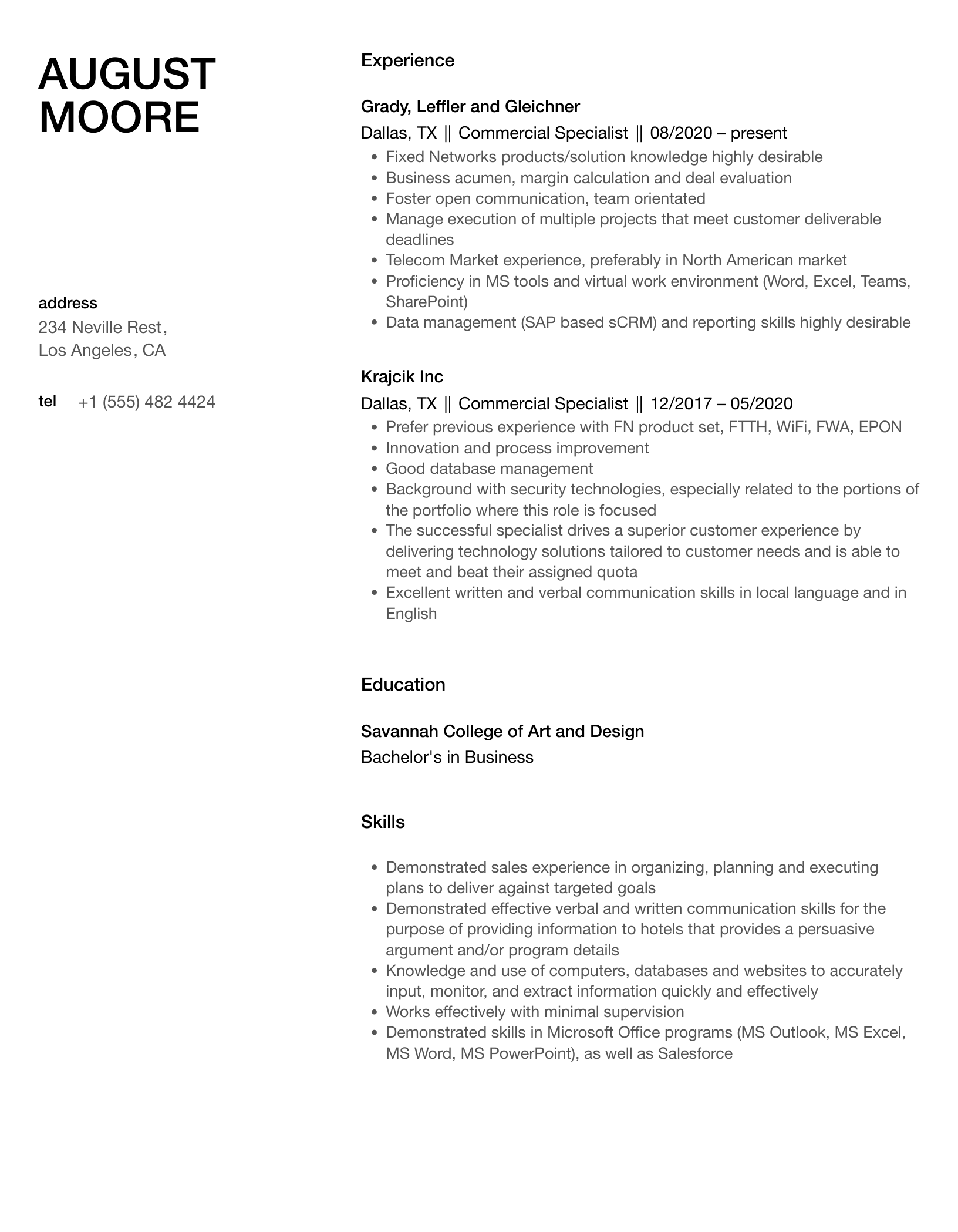 Guide the recruiter to the conclusion that you are the best candidate for the commercial specialist job. It’s actually very simple. Tailor your resume by picking relevant responsibilities from the examples below and then add your accomplishments. This way, you can position yourself in the best way to get hired.