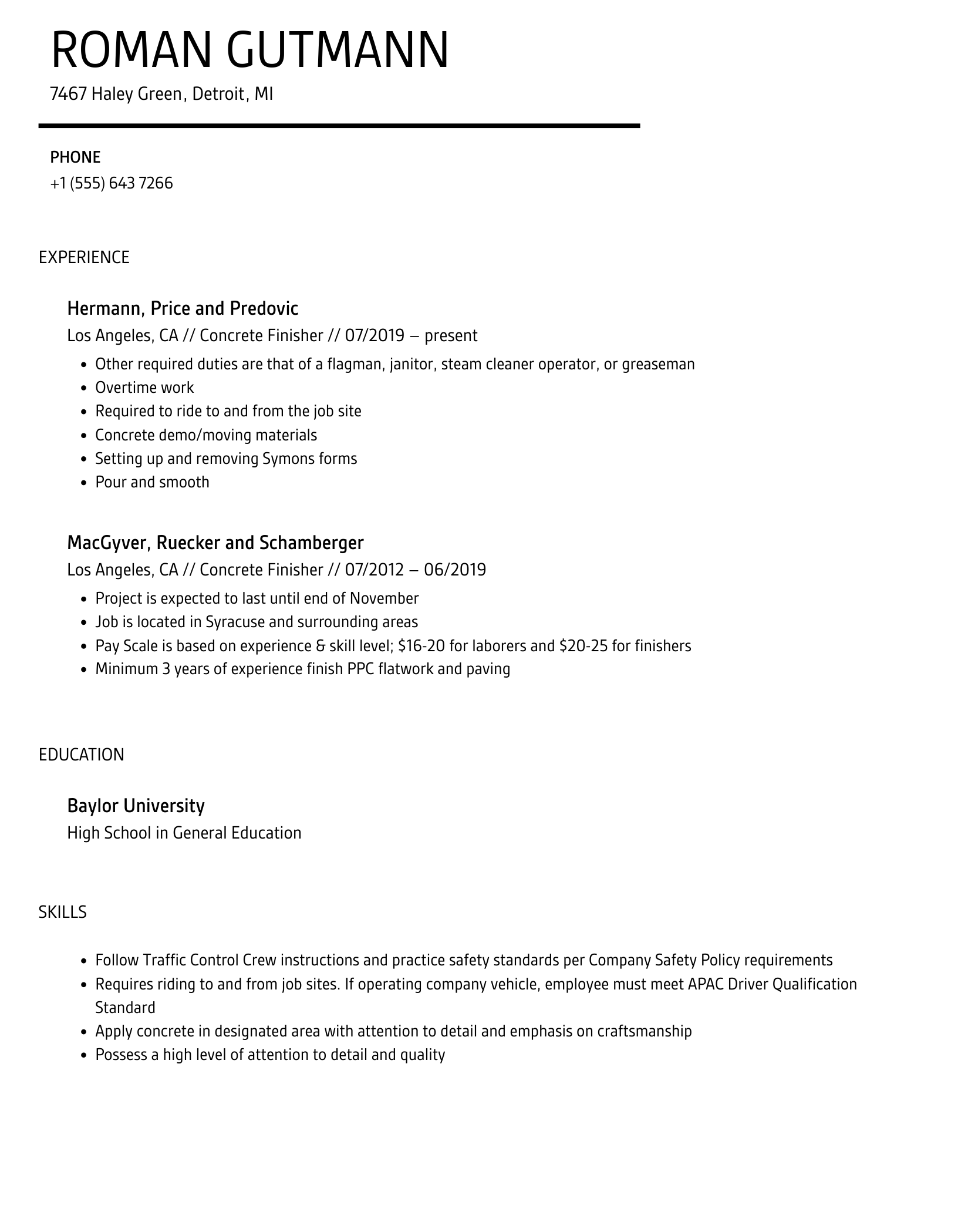Traveling Concrete Finisher & Concrete Laborer Resume Examples & Samples