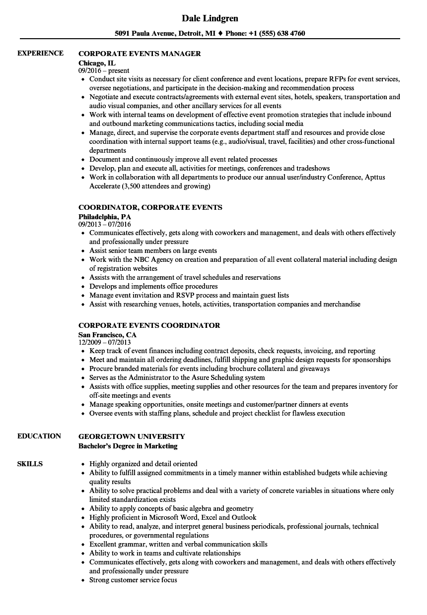 Guide the recruiter to the conclusion that you are the best candidate for the corporate events job. It’s actually very simple. Tailor your resume by picking relevant responsibilities from the examples below and then add your accomplishments. This way, you can position yourself in the best way to get hired.