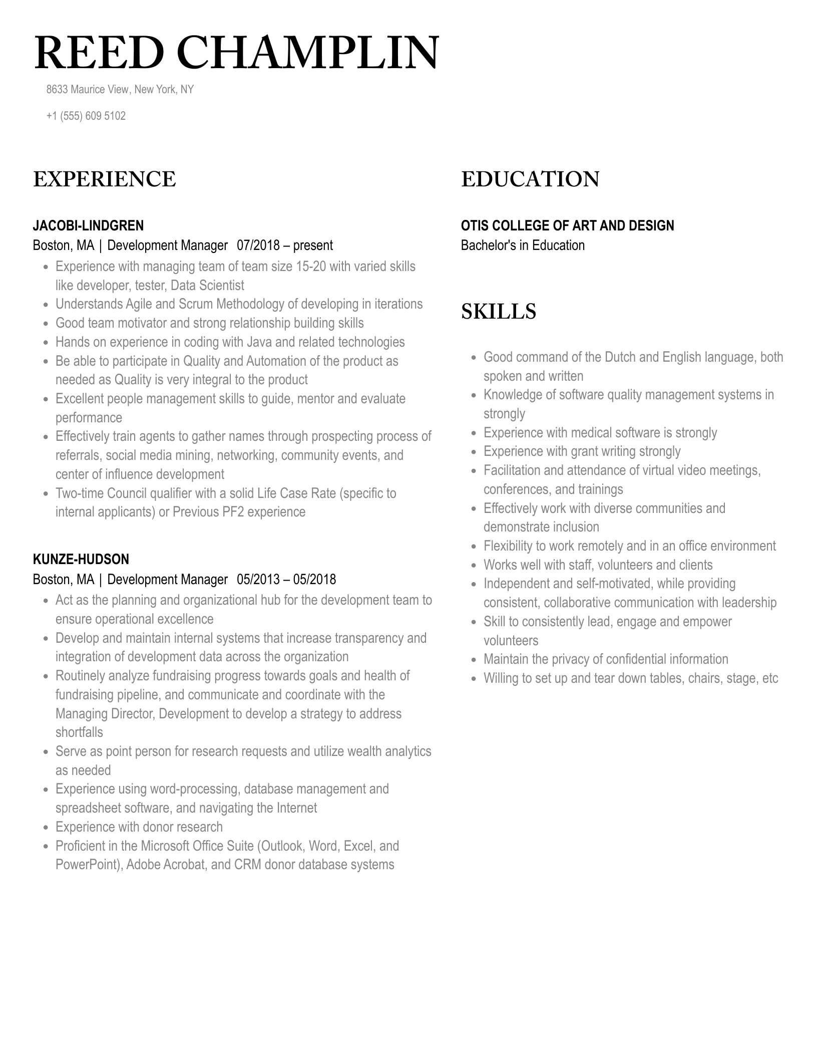Guide the recruiter to the conclusion that you are the best candidate for the development manager job. It’s actually very simple. Tailor your resume by picking relevant responsibilities from the examples below and then add your accomplishments. This way, you can position yourself in the best way to get hired.