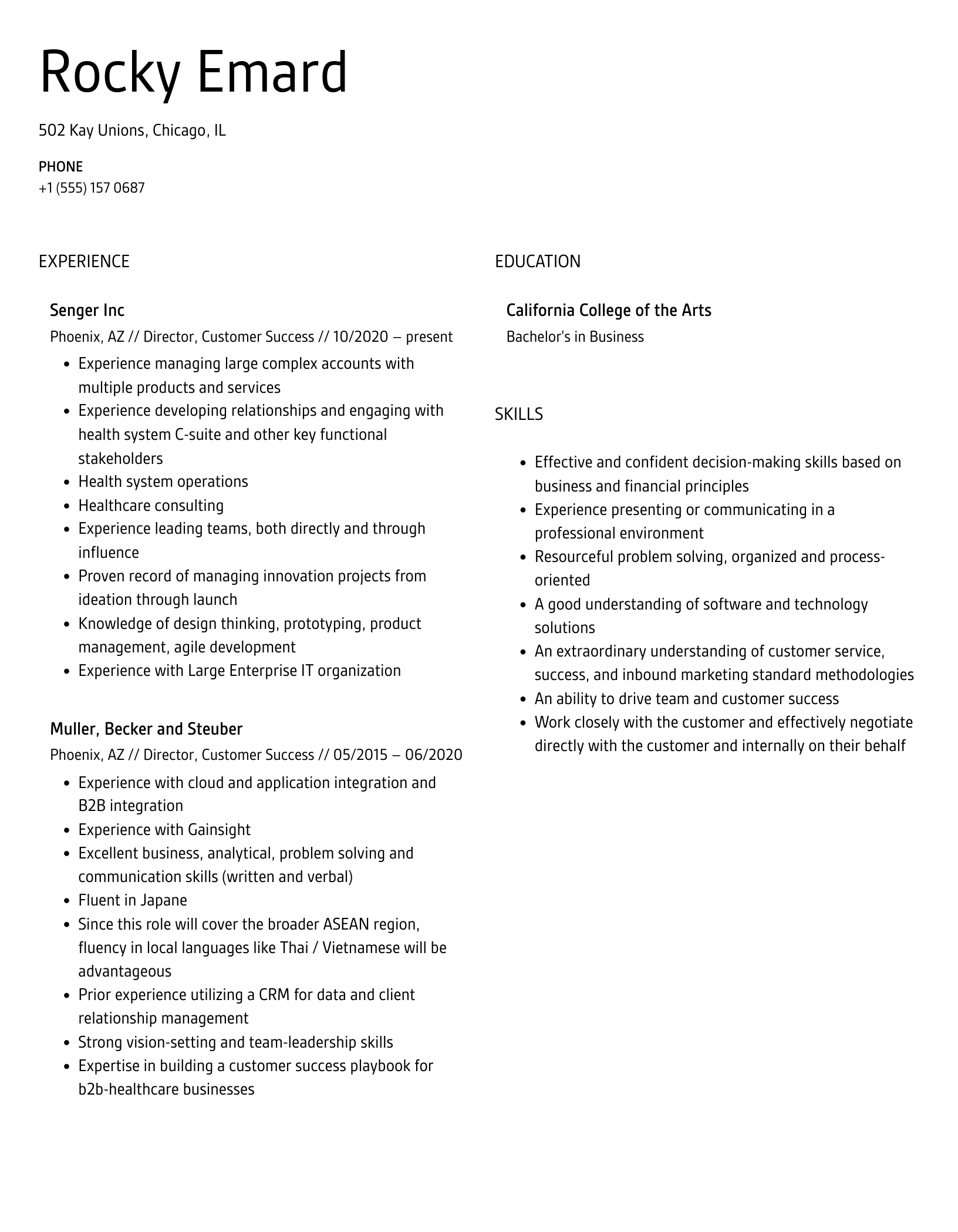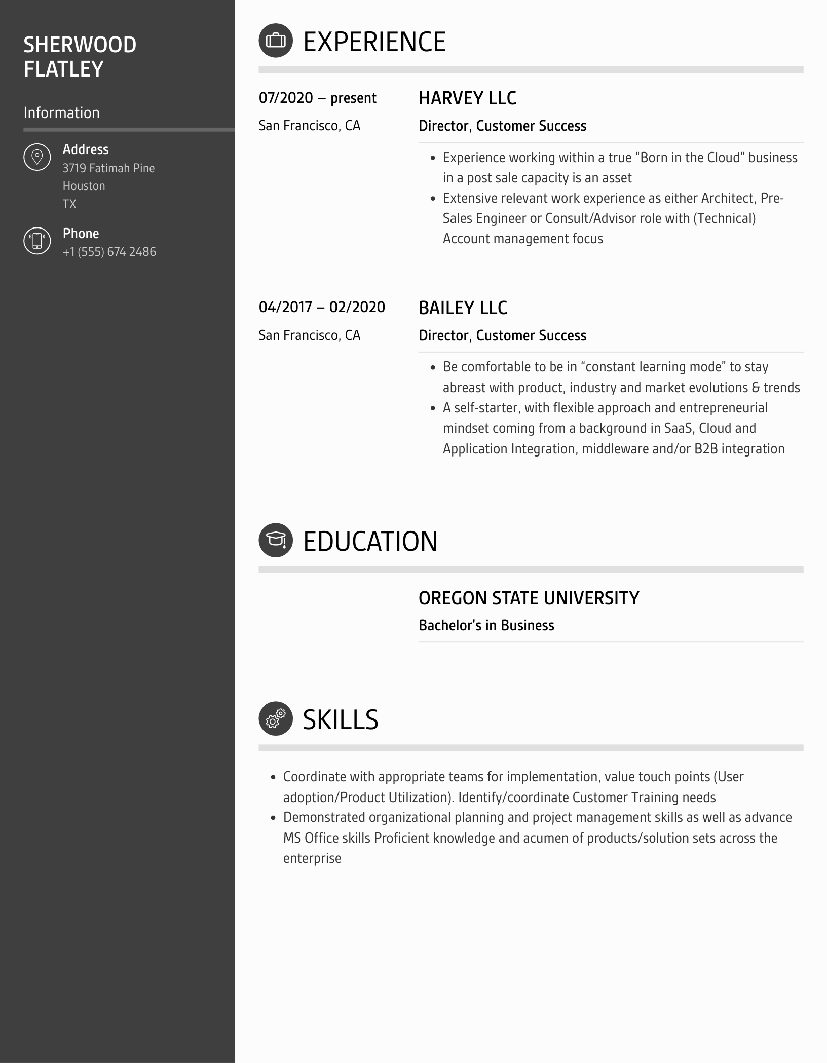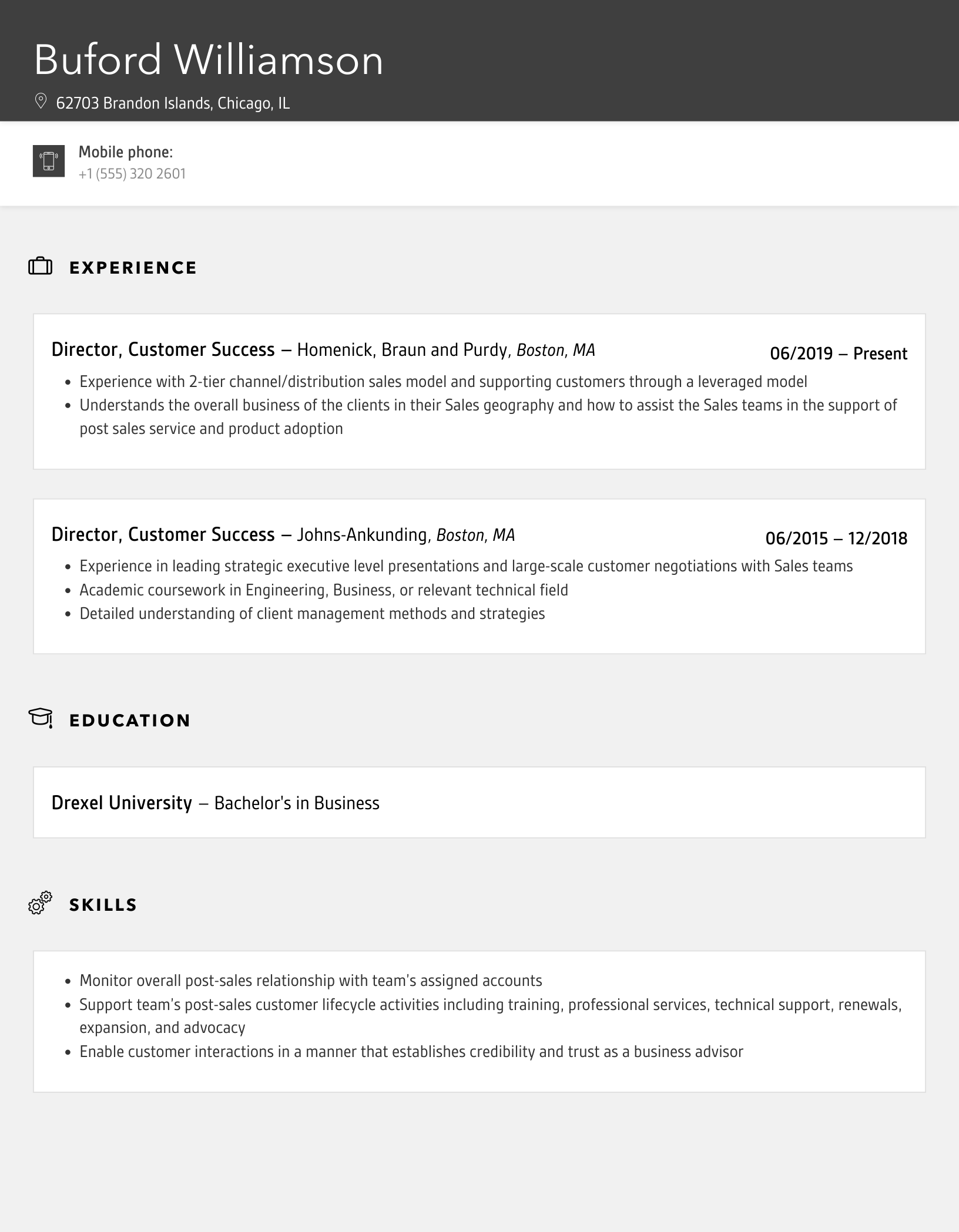 Guide the recruiter to the conclusion that you are the best candidate for the director, customer success job. It’s actually very simple. Tailor your resume by picking relevant responsibilities from the examples below and then add your accomplishments. This way, you can position yourself in the best way to get hired.