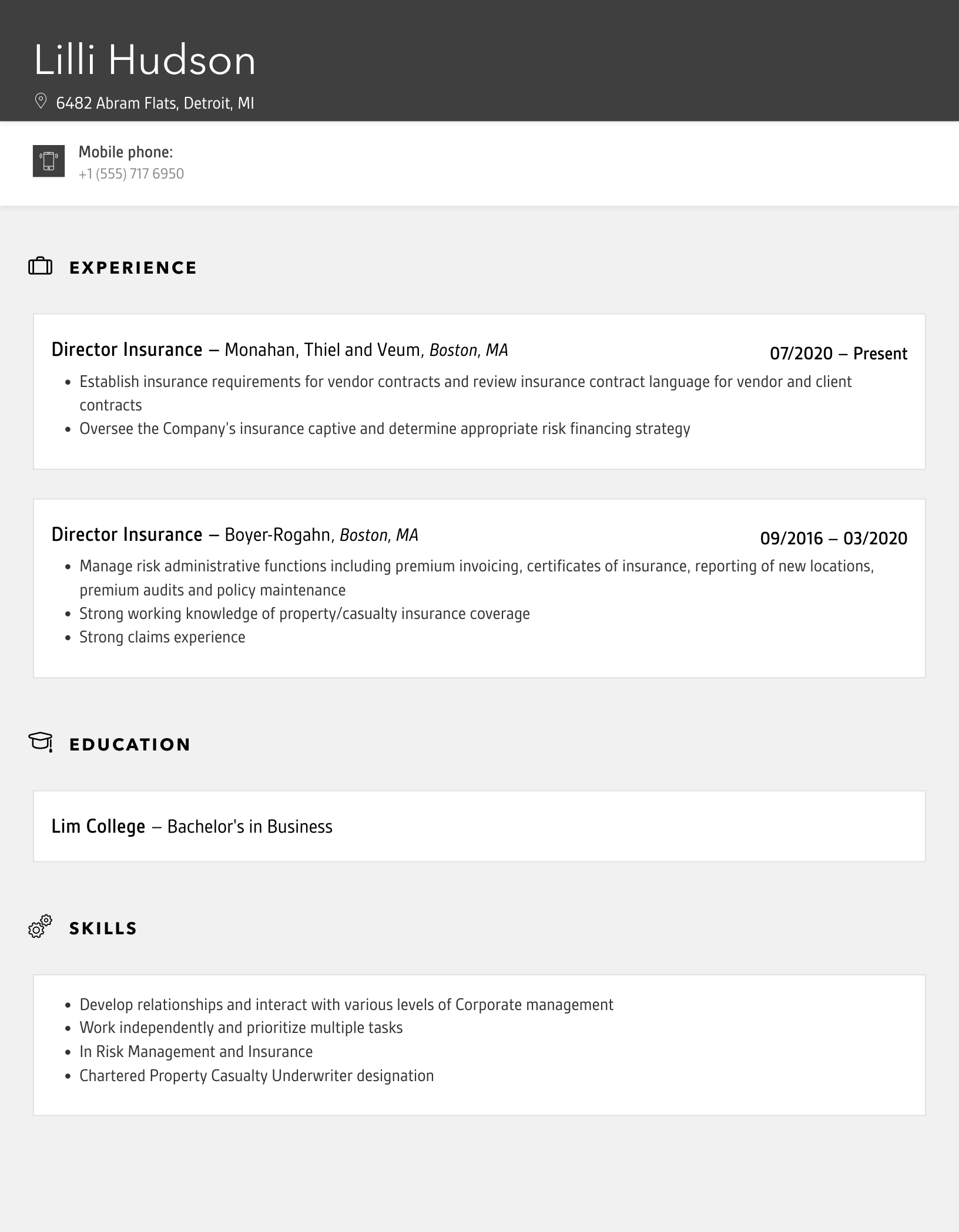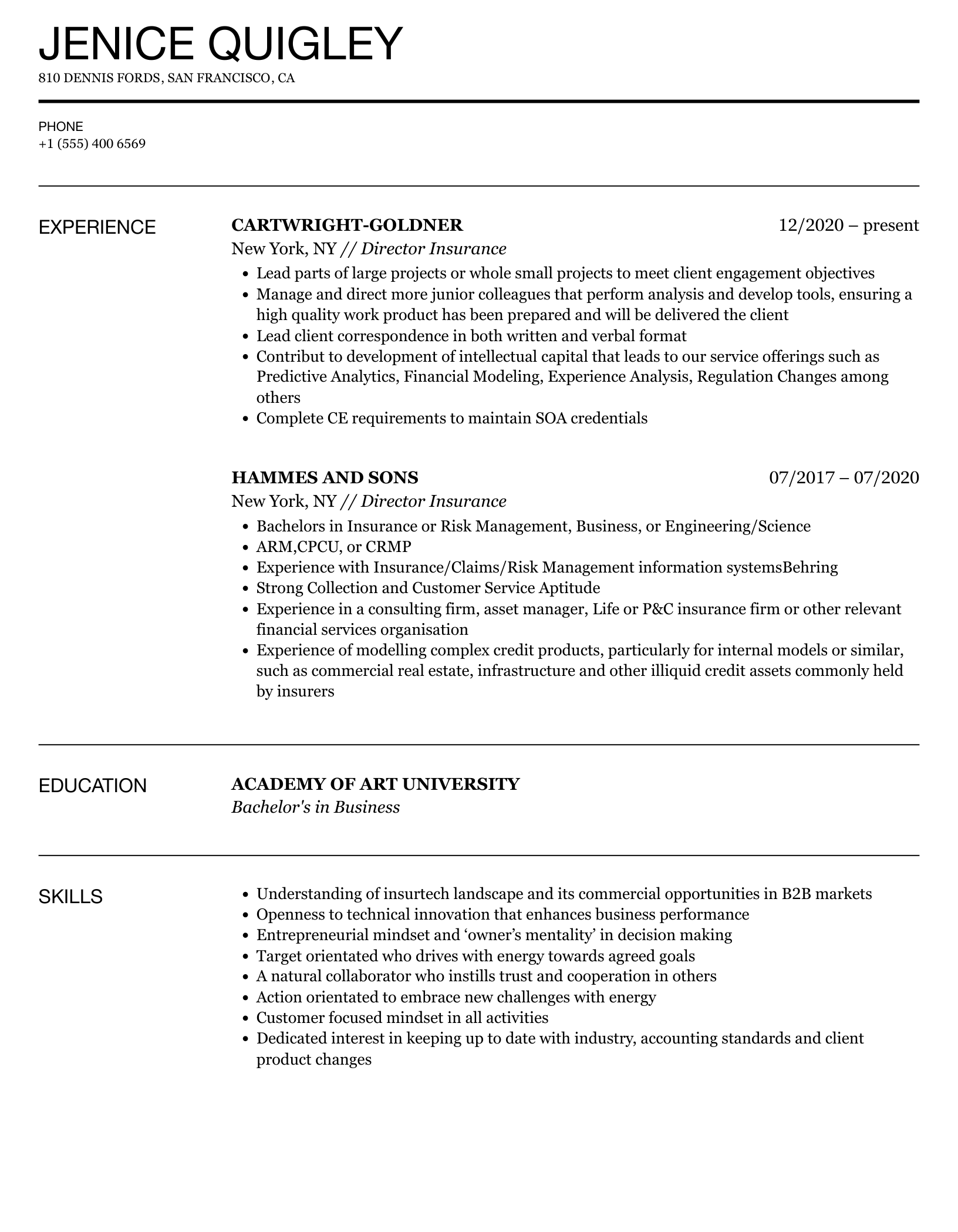 Guide the recruiter to the conclusion that you are the best candidate for the director insurance job. It’s actually very simple. Tailor your resume by picking relevant responsibilities from the examples below and then add your accomplishments. This way, you can position yourself in the best way to get hired.