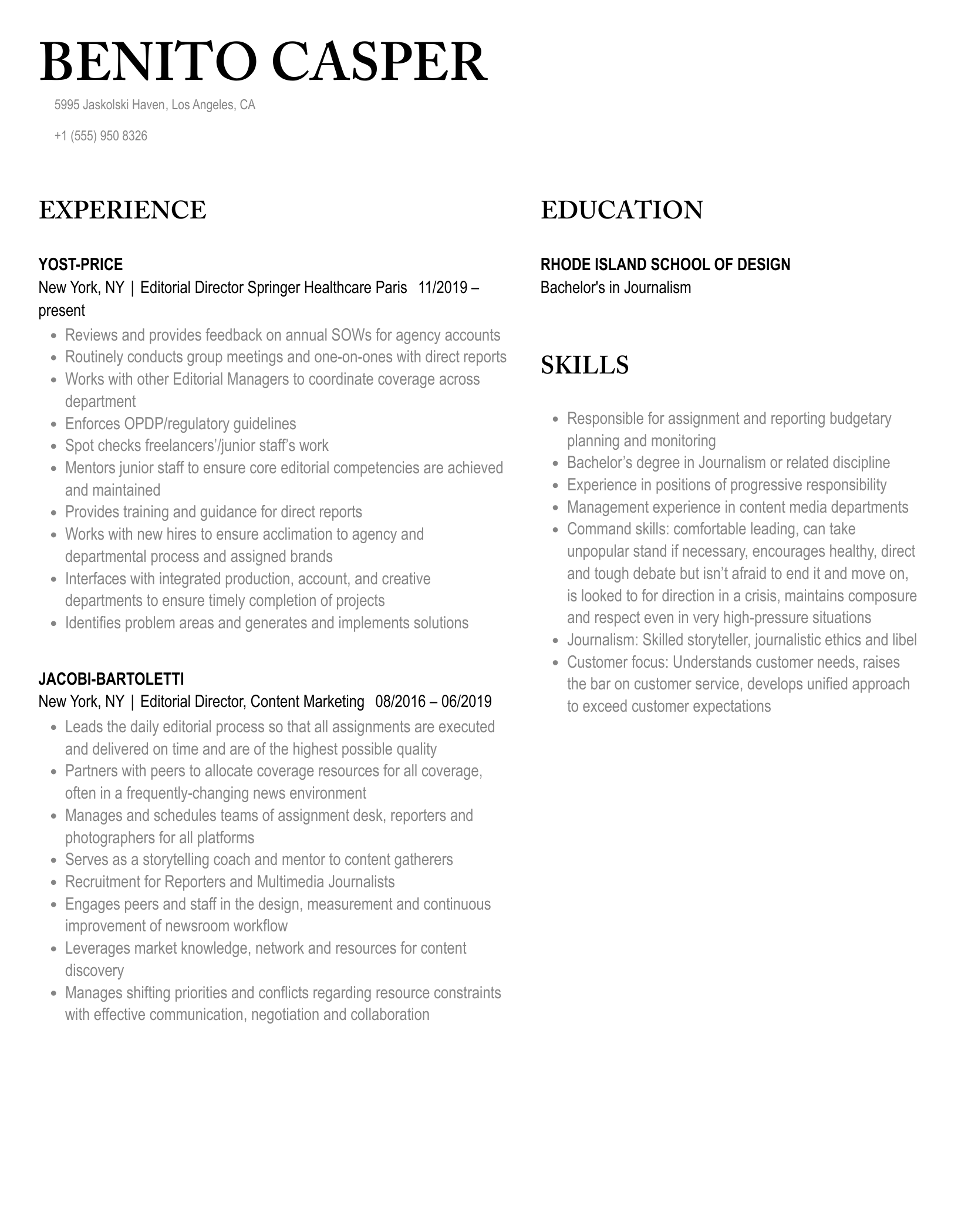 Guide the recruiter to the conclusion that you are the best candidate for the editorial director job. It’s actually very simple. Tailor your resume by picking relevant responsibilities from the examples below and then add your accomplishments. This way, you can position yourself in the best way to get hired.