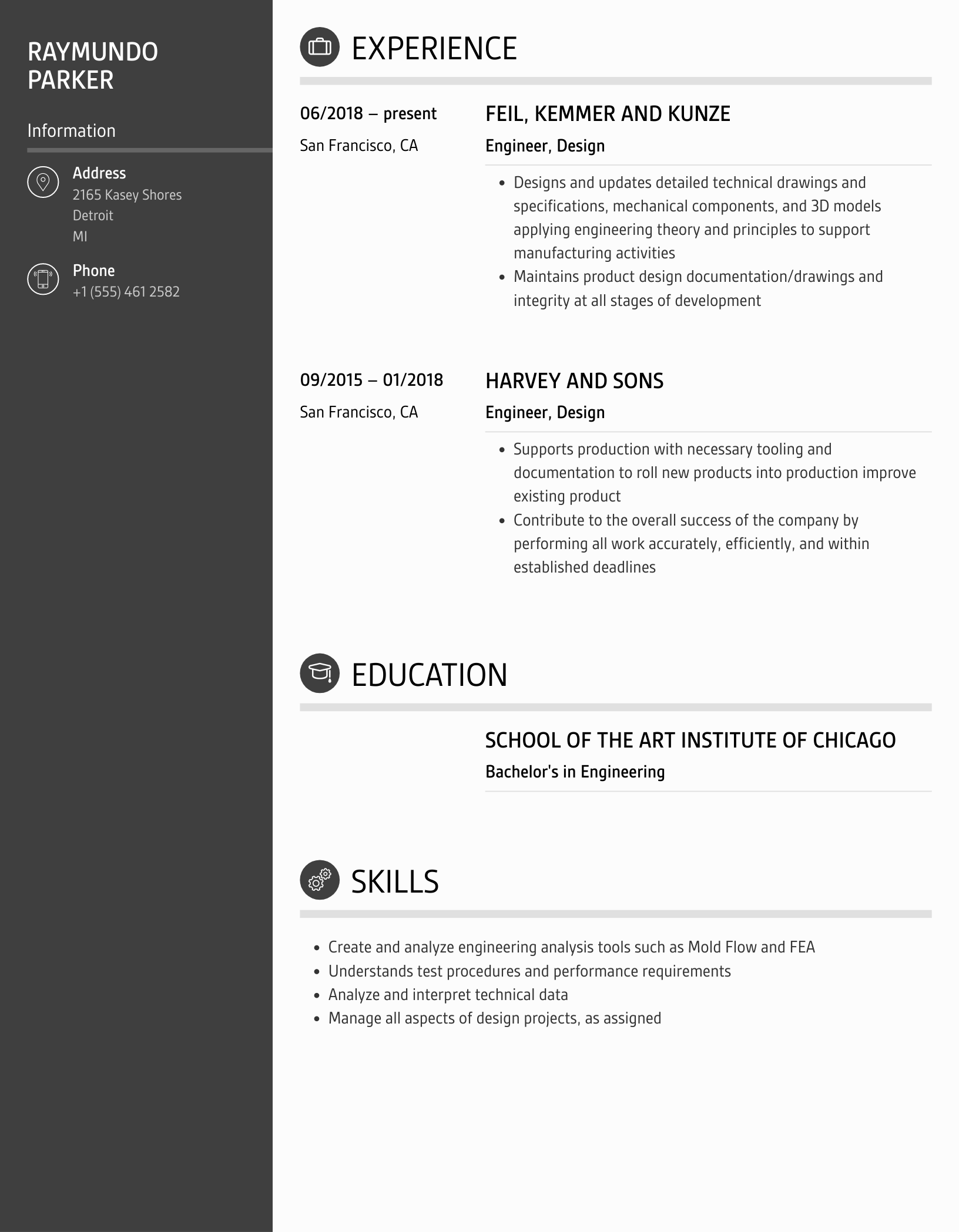 Guide the recruiter to the conclusion that you are the best candidate for the engineer, design job. It’s actually very simple. Tailor your resume by picking relevant responsibilities from the examples below and then add your accomplishments. This way, you can position yourself in the best way to get hired.