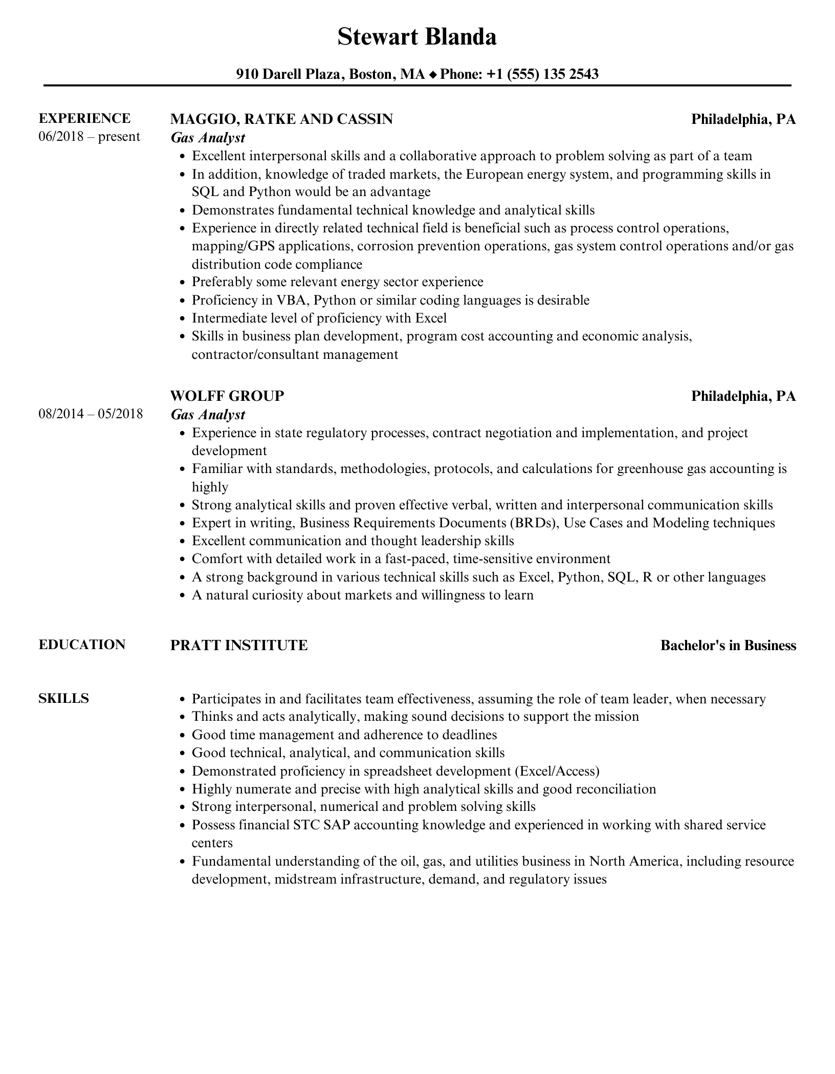 Analyst, MA Gas Resource Planning Resume Examples & Samples