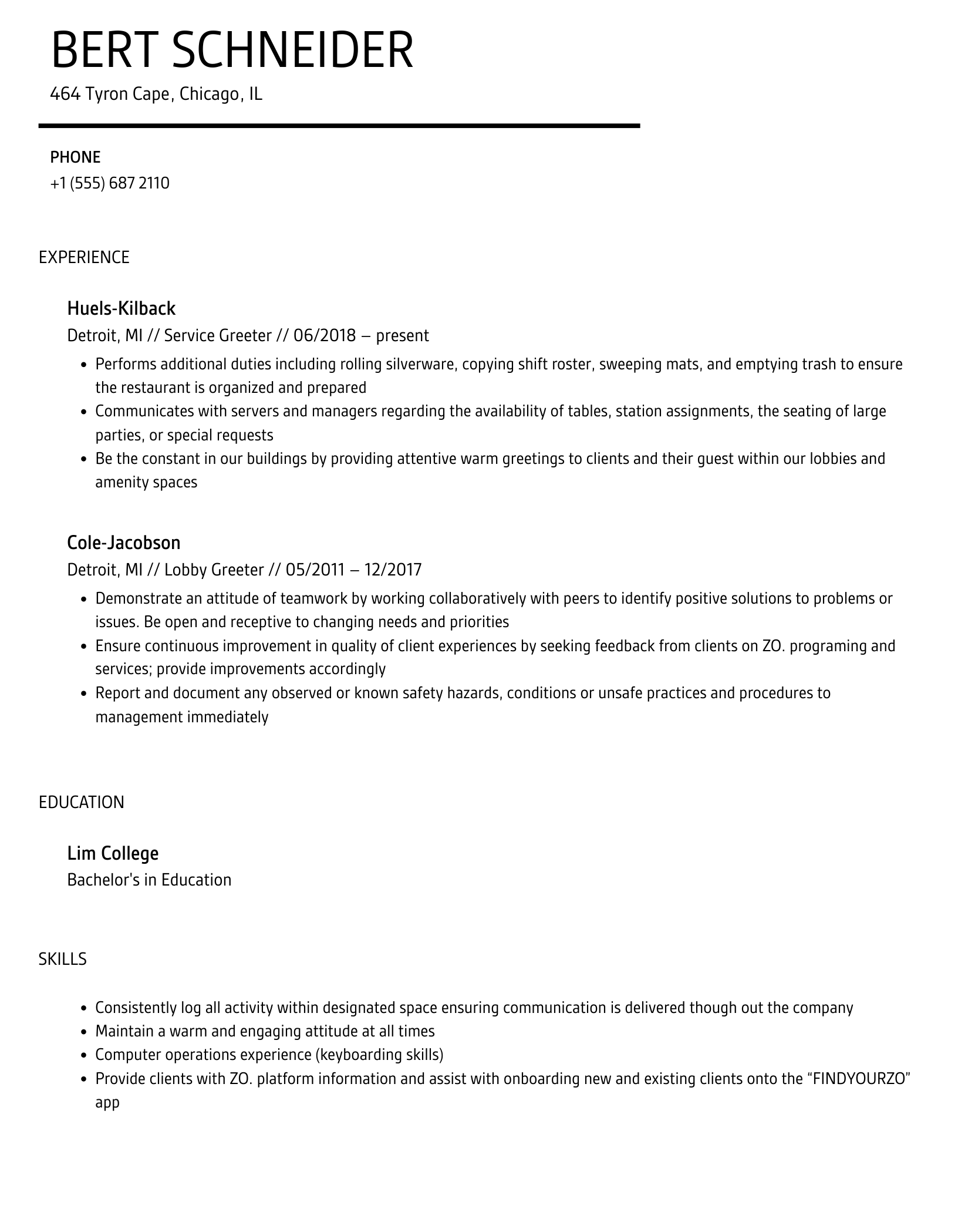 Guide the recruiter to the conclusion that you are the best candidate for the greeter job. It’s actually very simple. Tailor your resume by picking relevant responsibilities from the examples below and then add your accomplishments. This way, you can position yourself in the best way to get hired.