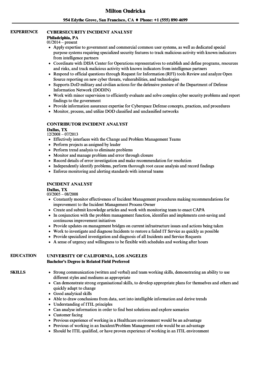 Guide the recruiter to the conclusion that you are the best candidate for the incident analyst job. It’s actually very simple. Tailor your resume by picking relevant responsibilities from the examples below and then add your accomplishments. This way, you can position yourself in the best way to get hired.