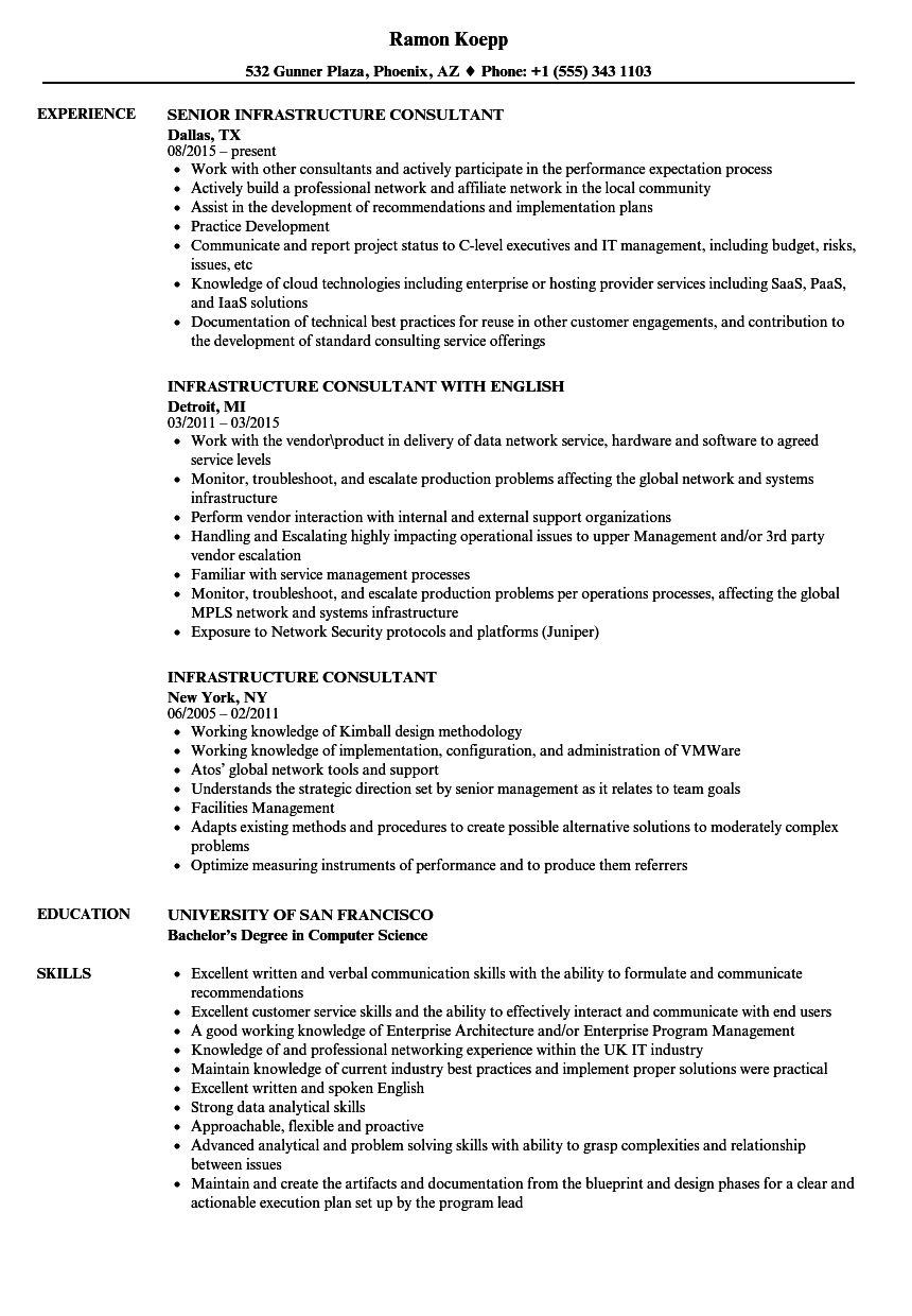 Guide the recruiter to the conclusion that you are the best candidate for the infrastructure consultant job. It’s actually very simple. Tailor your resume by picking relevant responsibilities from the examples below and then add your accomplishments. This way, you can position yourself in the best way to get hired.