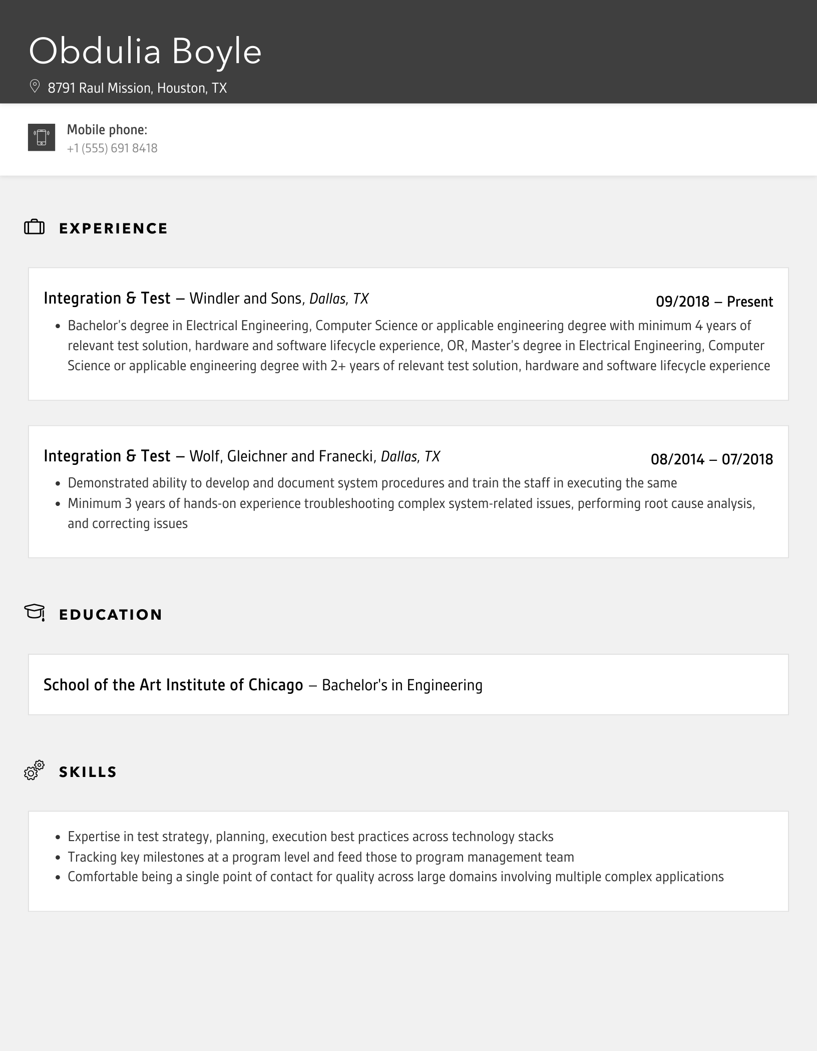 Guide the recruiter to the conclusion that you are the best candidate for the integration & test job. It’s actually very simple. Tailor your resume by picking relevant responsibilities from the examples below and then add your accomplishments. This way, you can position yourself in the best way to get hired.
