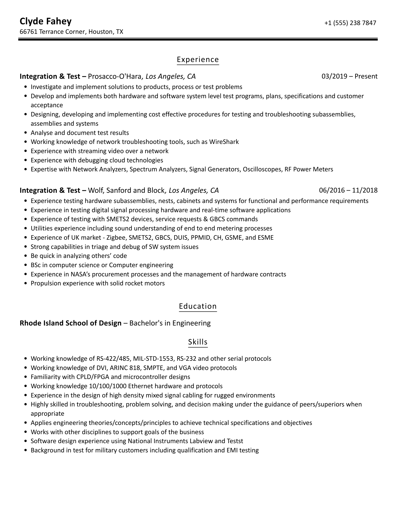 Onboard Integration & Test Lead Engineer Resume Examples & Samples