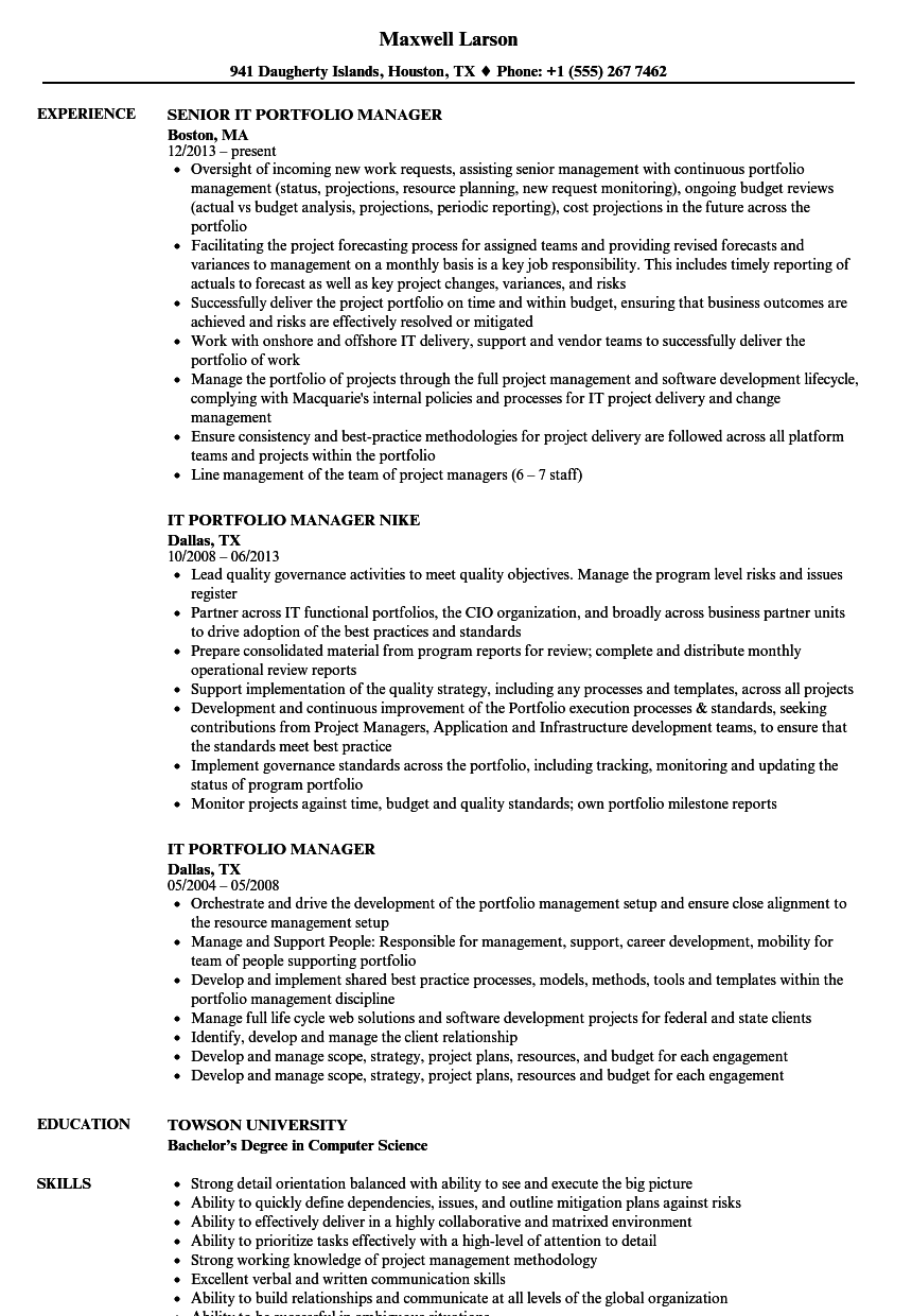 Guide the recruiter to the conclusion that you are the best candidate for the it portfolio manager job. It’s actually very simple. Tailor your resume by picking relevant responsibilities from the examples below and then add your accomplishments. This way, you can position yourself in the best way to get hired.