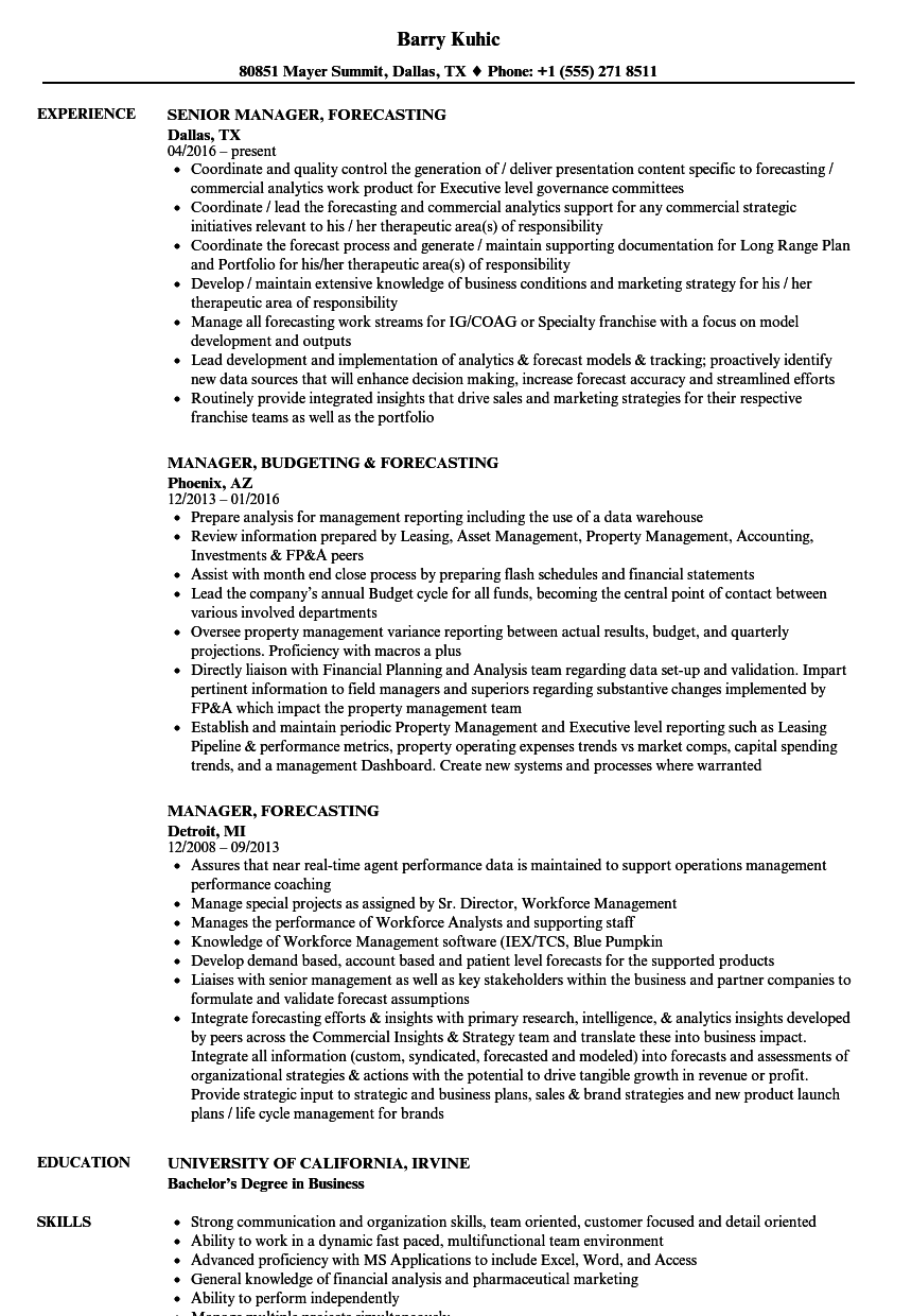 Guide the recruiter to the conclusion that you are the best candidate for the manager, forecasting job. It’s actually very simple. Tailor your resume by picking relevant responsibilities from the examples below and then add your accomplishments. This way, you can position yourself in the best way to get hired.