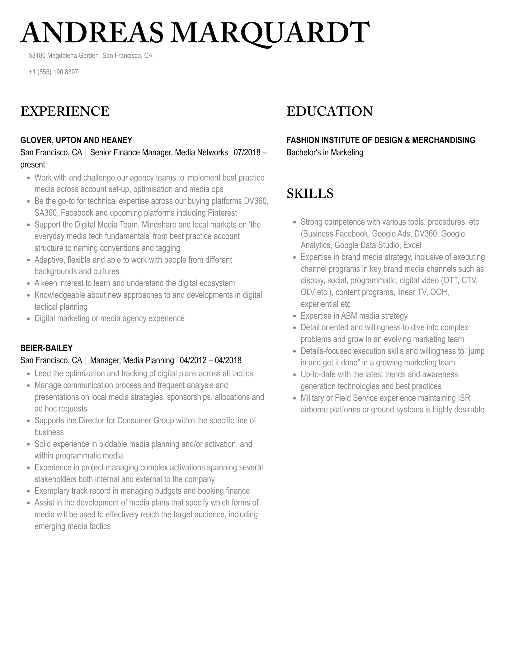 Guide the recruiter to the conclusion that you are the best candidate for the manager, media job. It’s actually very simple. Tailor your resume by picking relevant responsibilities from the examples below and then add your accomplishments. This way, you can position yourself in the best way to get hired.