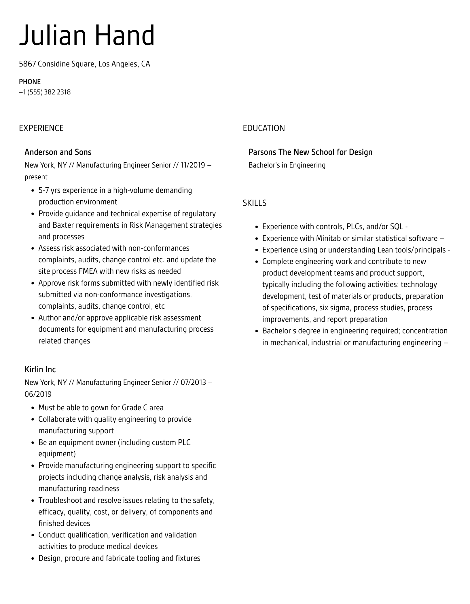 Manufacturing Engineer, Senior Resume Examples & Samples