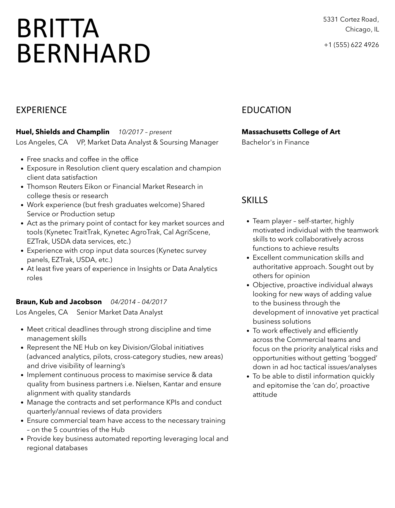 Guide the recruiter to the conclusion that you are the best candidate for the market data analyst job. It’s actually very simple. Tailor your resume by picking relevant responsibilities from the examples below and then add your accomplishments. This way, you can position yourself in the best way to get hired.
