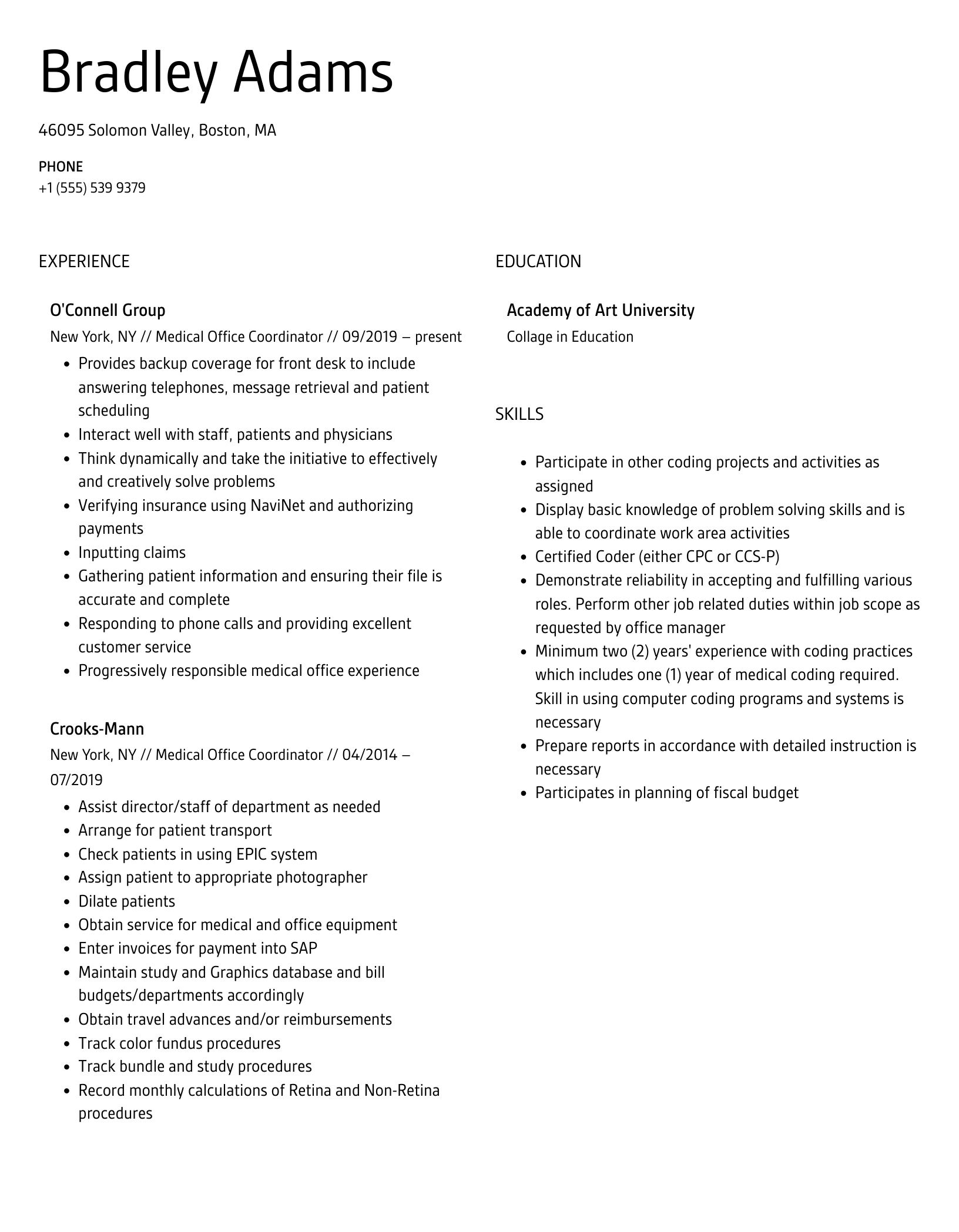 Guide the recruiter to the conclusion that you are the best candidate for the medical office coordinator job. It’s actually very simple. Tailor your resume by picking relevant responsibilities from the examples below and then add your accomplishments. This way, you can position yourself in the best way to get hired.