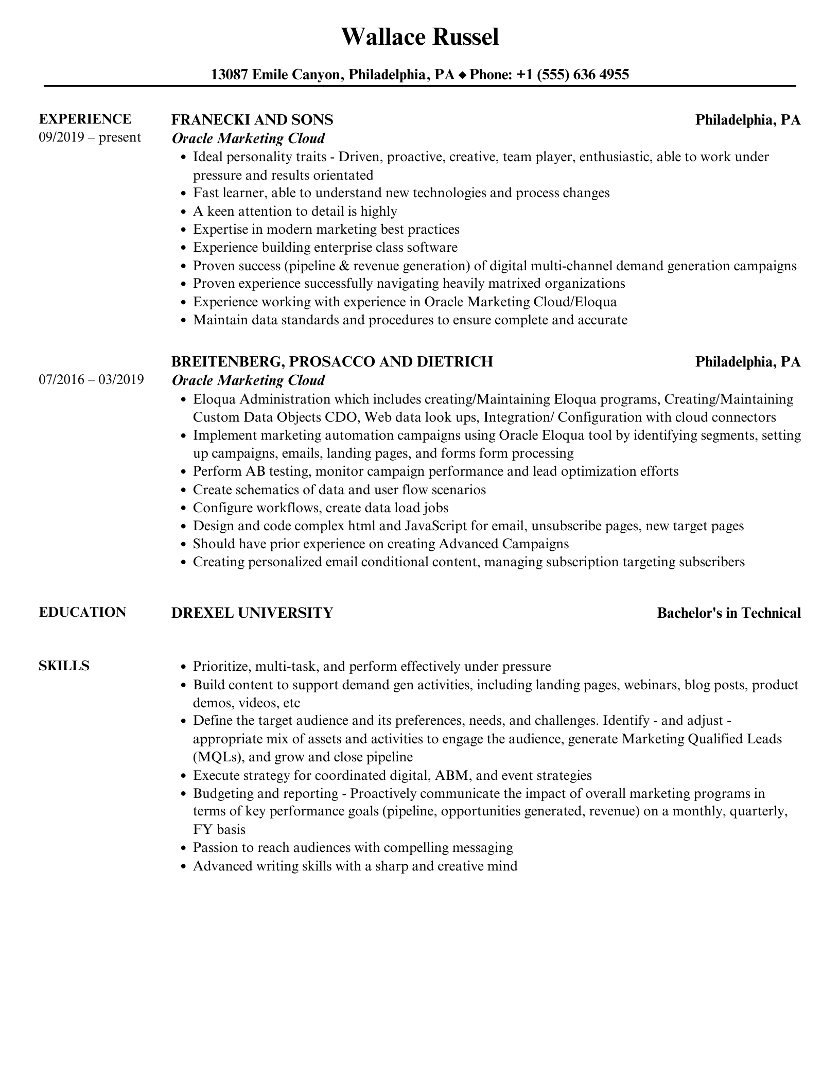Marketing Manager, Oracle Marketing Cloud Resume Examples & Samples