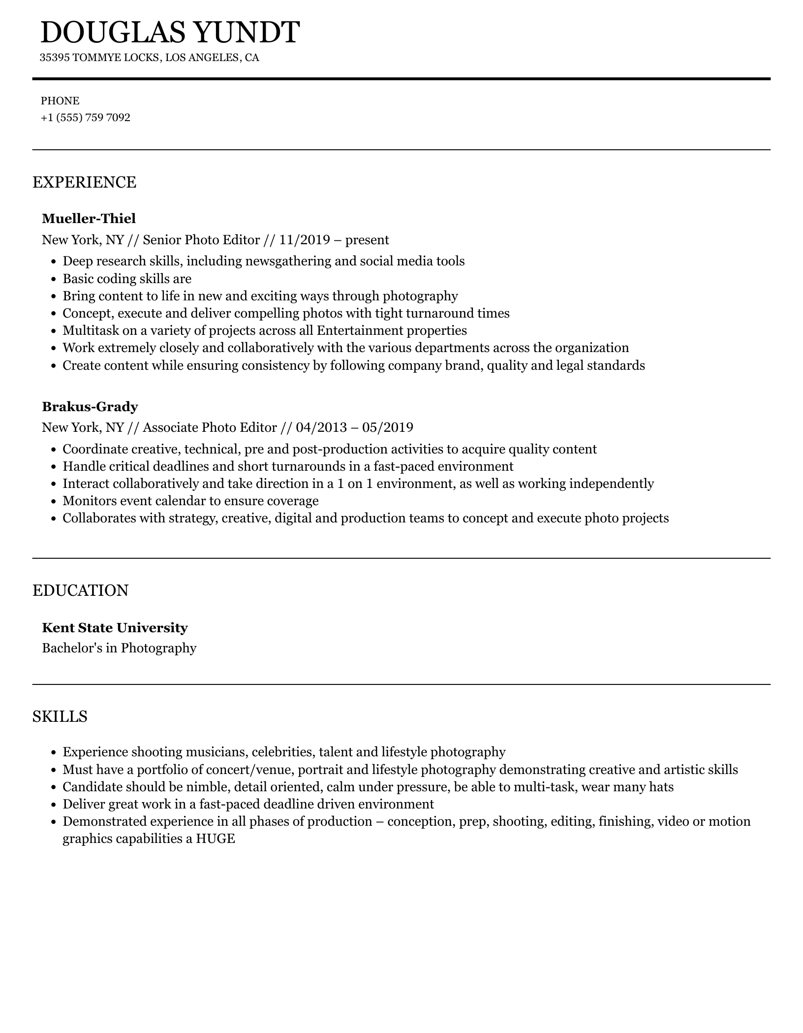 Guide the recruiter to the conclusion that you are the best candidate for the photo editor job. It’s actually very simple. Tailor your resume by picking relevant responsibilities from the examples below and then add your accomplishments. This way, you can position yourself in the best way to get hired.