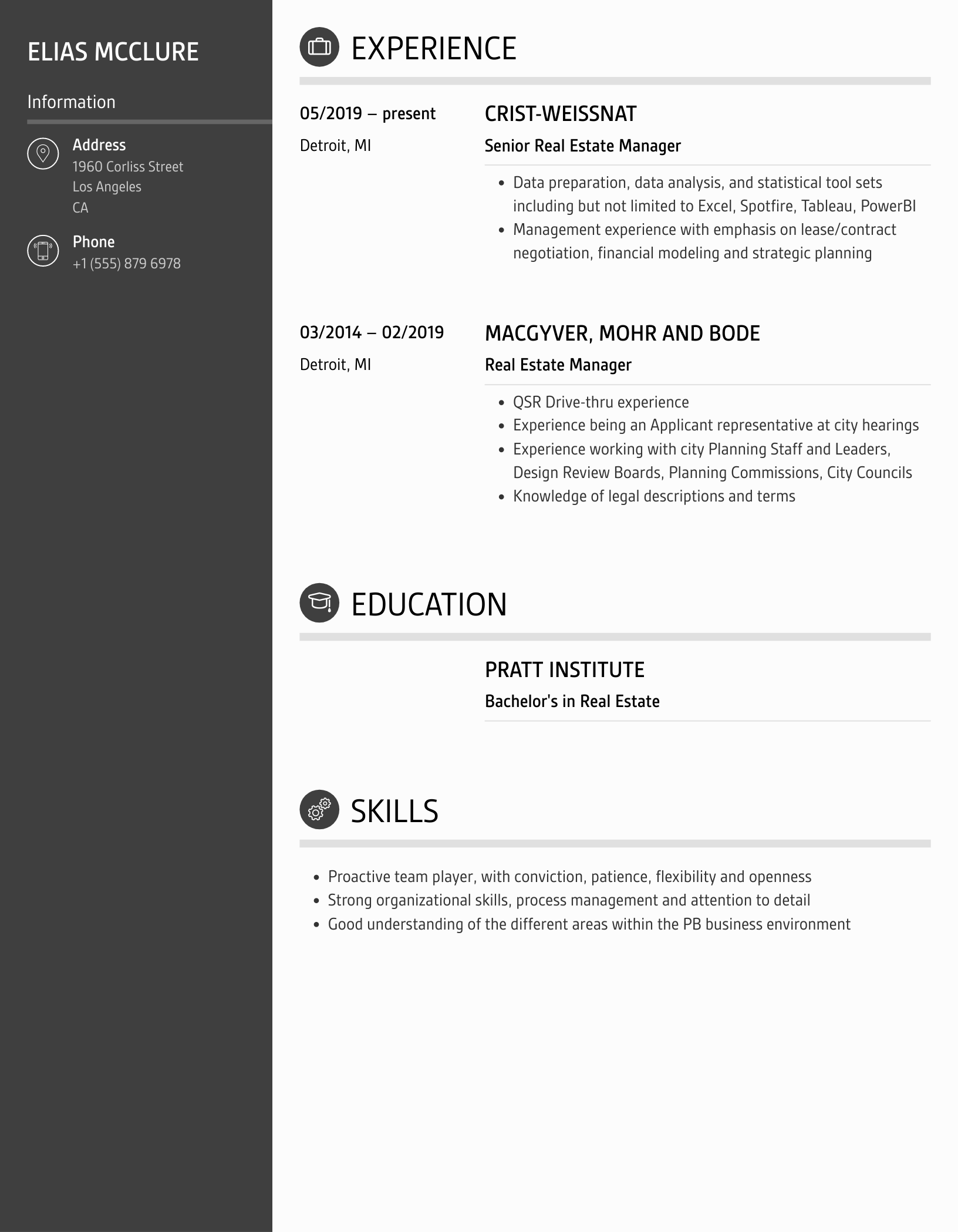 Guide the recruiter to the conclusion that you are the best candidate for the real estate manager job. It’s actually very simple. Tailor your resume by picking relevant responsibilities from the examples below and then add your accomplishments. This way, you can position yourself in the best way to get hired.