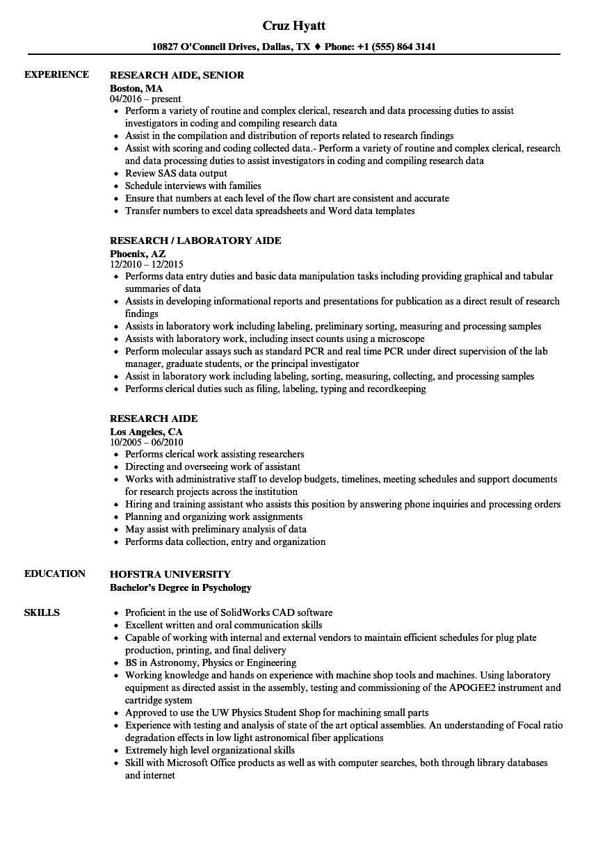 Guide the recruiter to the conclusion that you are the best candidate for the research aide job. It’s actually very simple. Tailor your resume by picking relevant responsibilities from the examples below and then add your accomplishments. This way, you can position yourself in the best way to get hired.