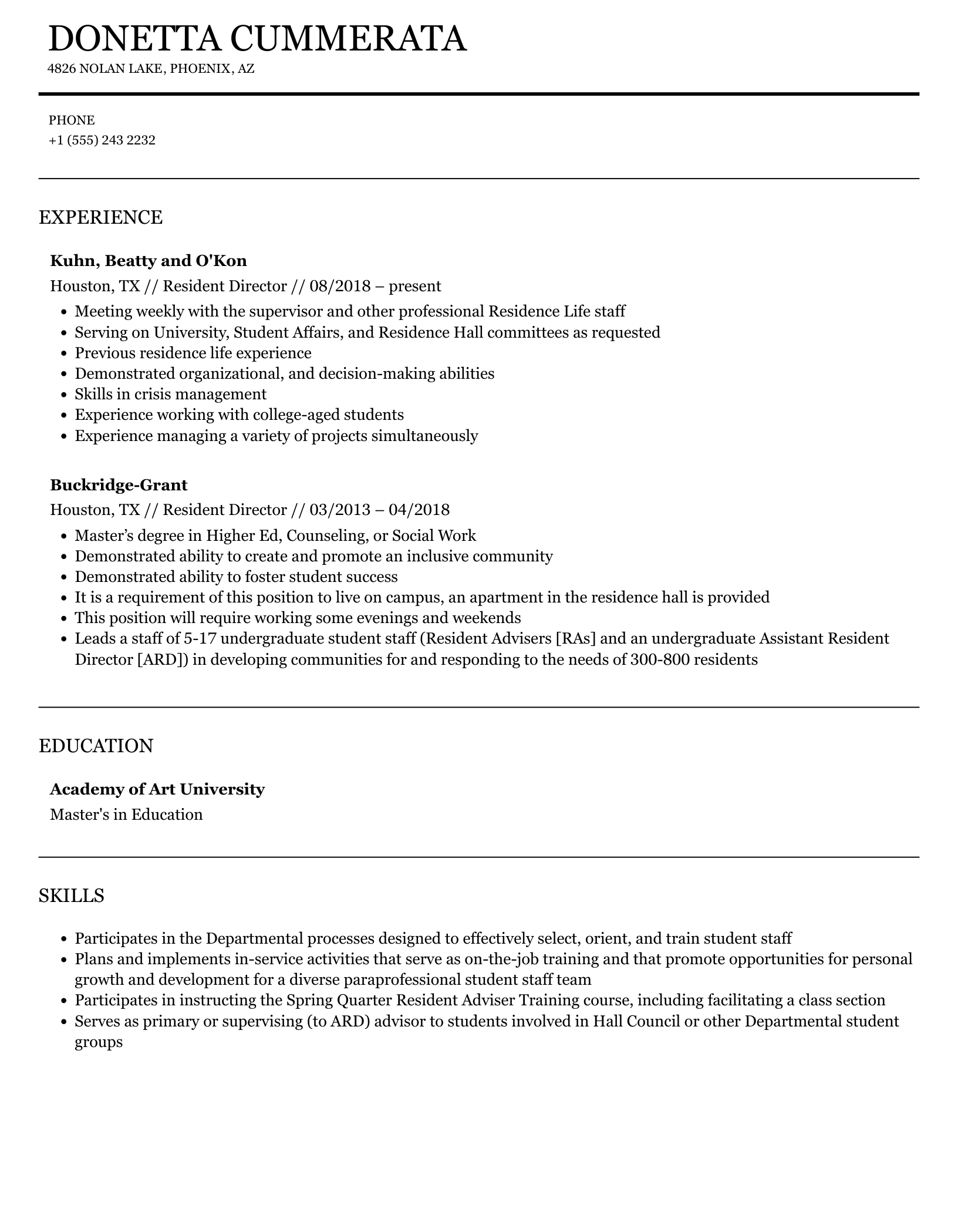 Guide the recruiter to the conclusion that you are the best candidate for the resident director job. It’s actually very simple. Tailor your resume by picking relevant responsibilities from the examples below and then add your accomplishments. This way, you can position yourself in the best way to get hired.