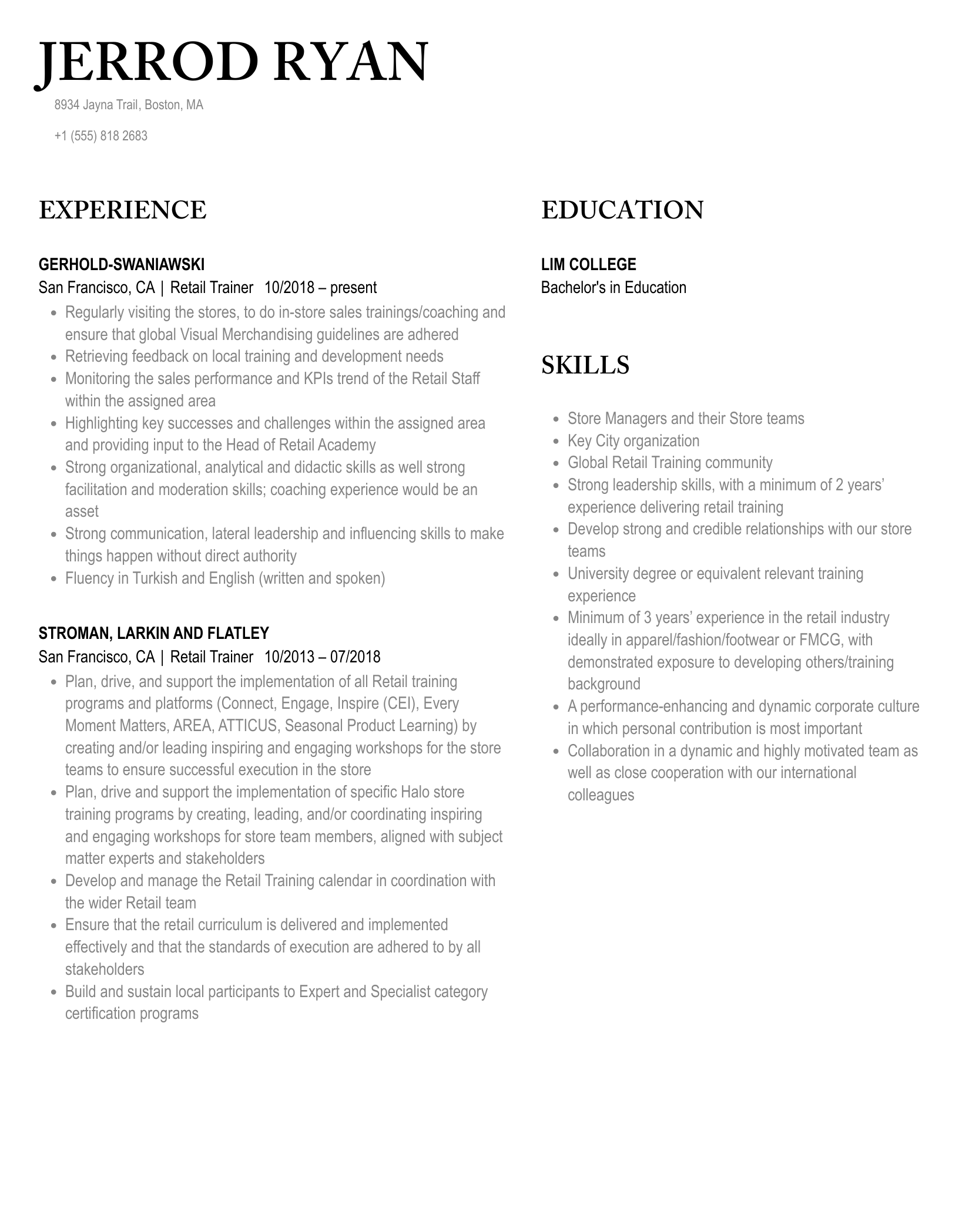 Guide the recruiter to the conclusion that you are the best candidate for the retail trainer job. It’s actually very simple. Tailor your resume by picking relevant responsibilities from the examples below and then add your accomplishments. This way, you can position yourself in the best way to get hired.