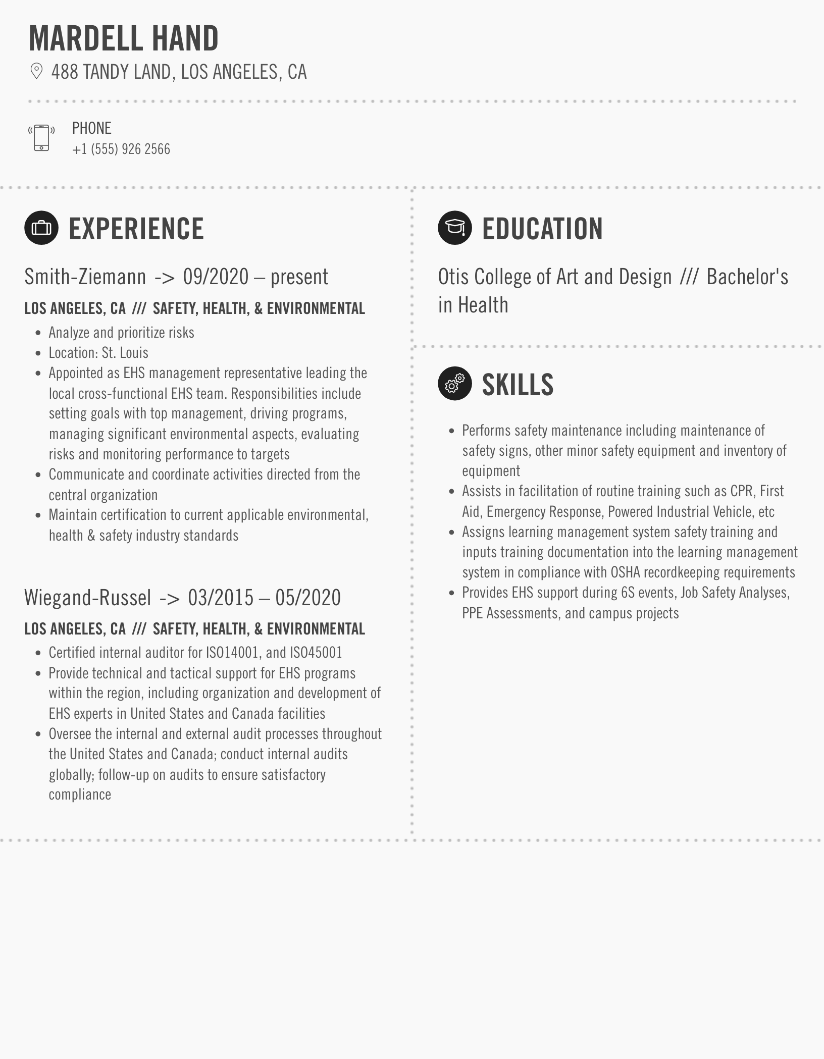 Guide the recruiter to the conclusion that you are the best candidate for the safety, health, & environmental job. It’s actually very simple. Tailor your resume by picking relevant responsibilities from the examples below and then add your accomplishments. This way, you can position yourself in the best way to get hired.