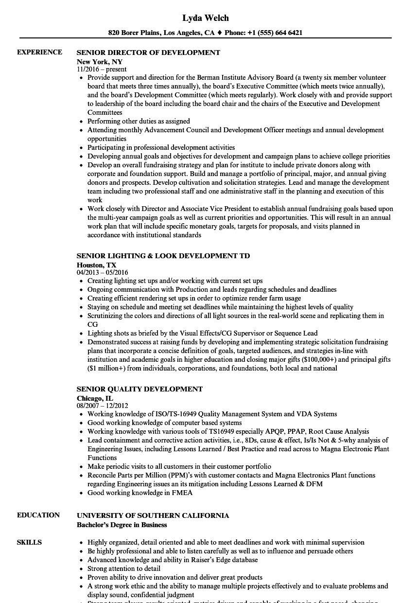 Guide the recruiter to the conclusion that you are the best candidate for the senior development job. It’s actually very simple. Tailor your resume by picking relevant responsibilities from the examples below and then add your accomplishments. This way, you can position yourself in the best way to get hired.