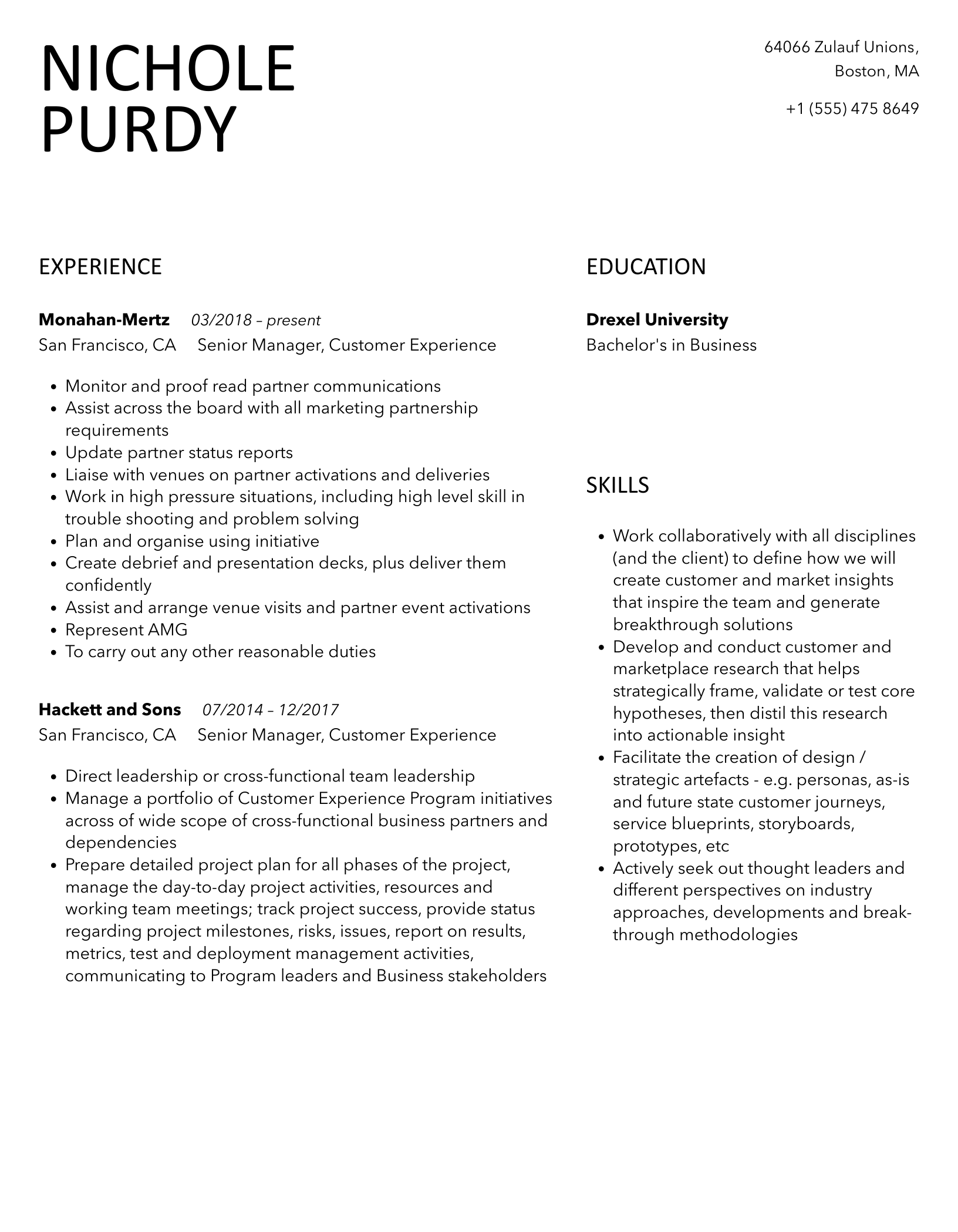 Guide the recruiter to the conclusion that you are the best candidate for the senior manager, customer experience job. It’s actually very simple. Tailor your resume by picking relevant responsibilities from the examples below and then add your accomplishments. This way, you can position yourself in the best way to get hired.