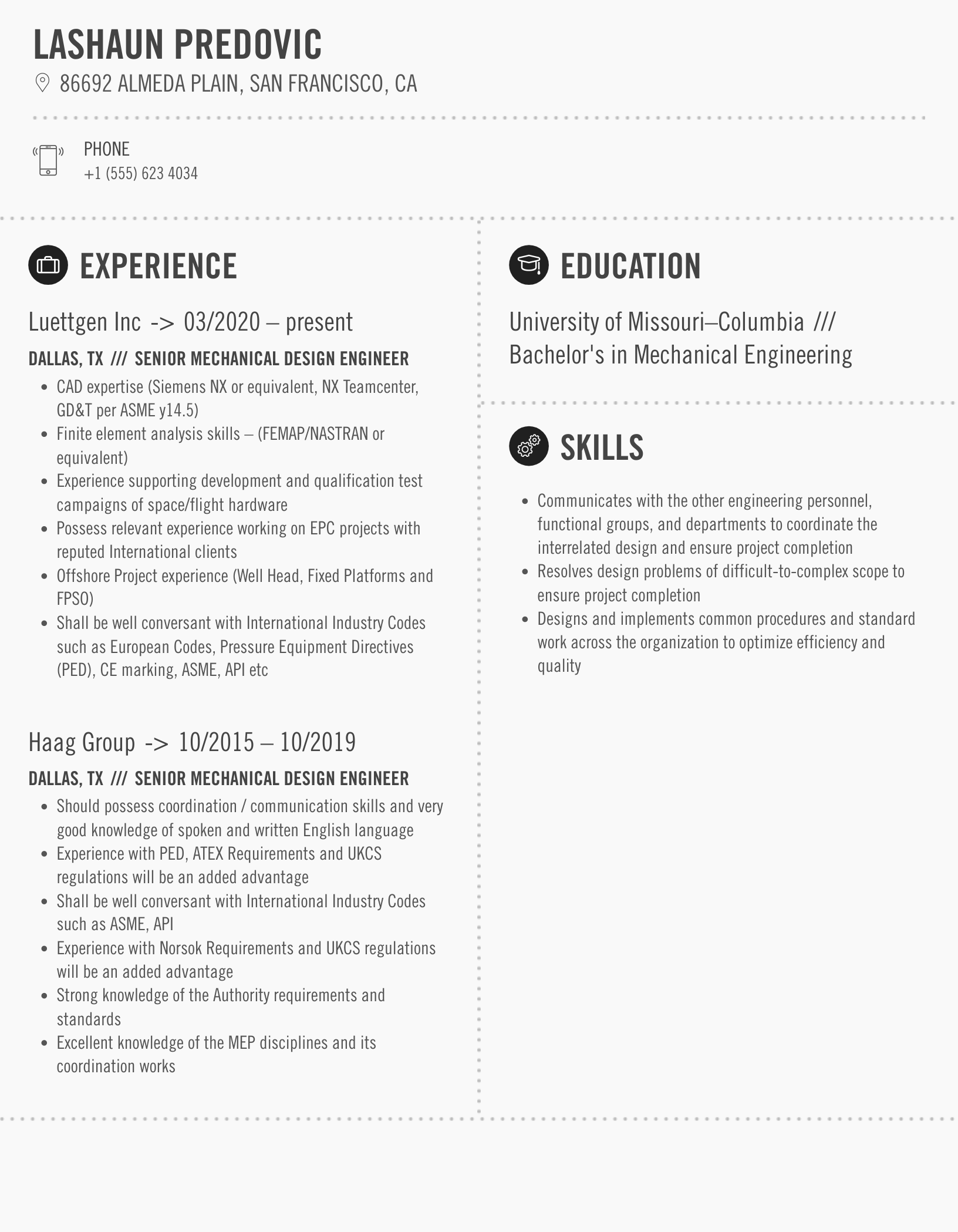 Guide the recruiter to the conclusion that you are the best candidate for the senior mechanical design engineer job. It’s actually very simple. Tailor your resume by picking relevant responsibilities from the examples below and then add your accomplishments. This way, you can position yourself in the best way to get hired.