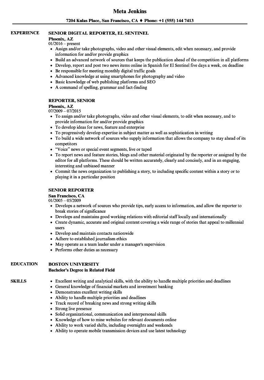 Guide the recruiter to the conclusion that you are the best candidate for the senior reporter job. It’s actually very simple. Tailor your resume by picking relevant responsibilities from the examples below and then add your accomplishments. This way, you can position yourself in the best way to get hired.