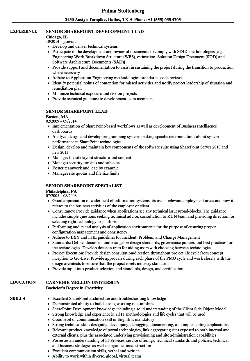 Guide the recruiter to the conclusion that you are the best candidate for the senior sharepoint job. It’s actually very simple. Tailor your resume by picking relevant responsibilities from the examples below and then add your accomplishments. This way, you can position yourself in the best way to get hired.