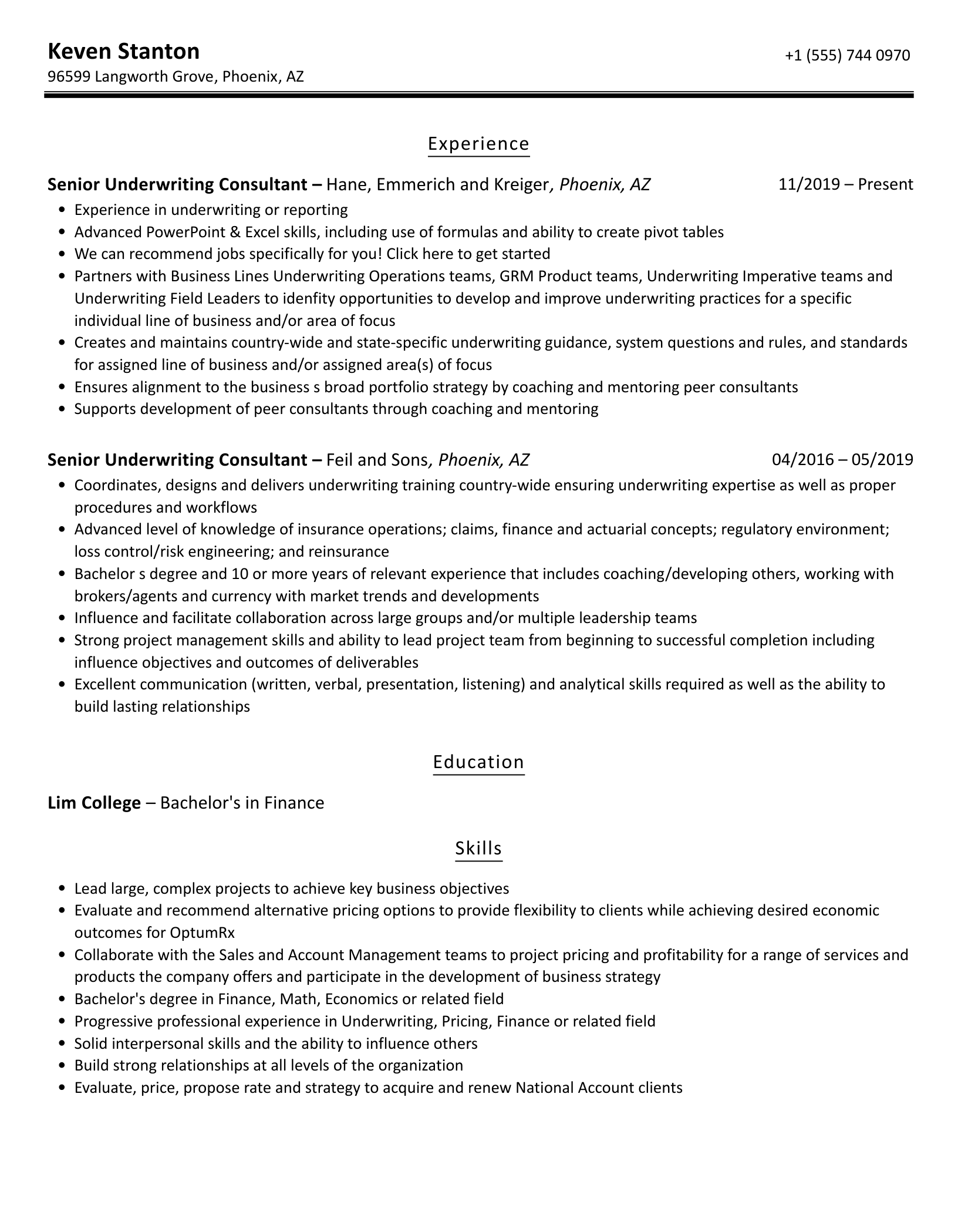 Senior Underwriting Consultant, Rockville Resume Examples & Samples