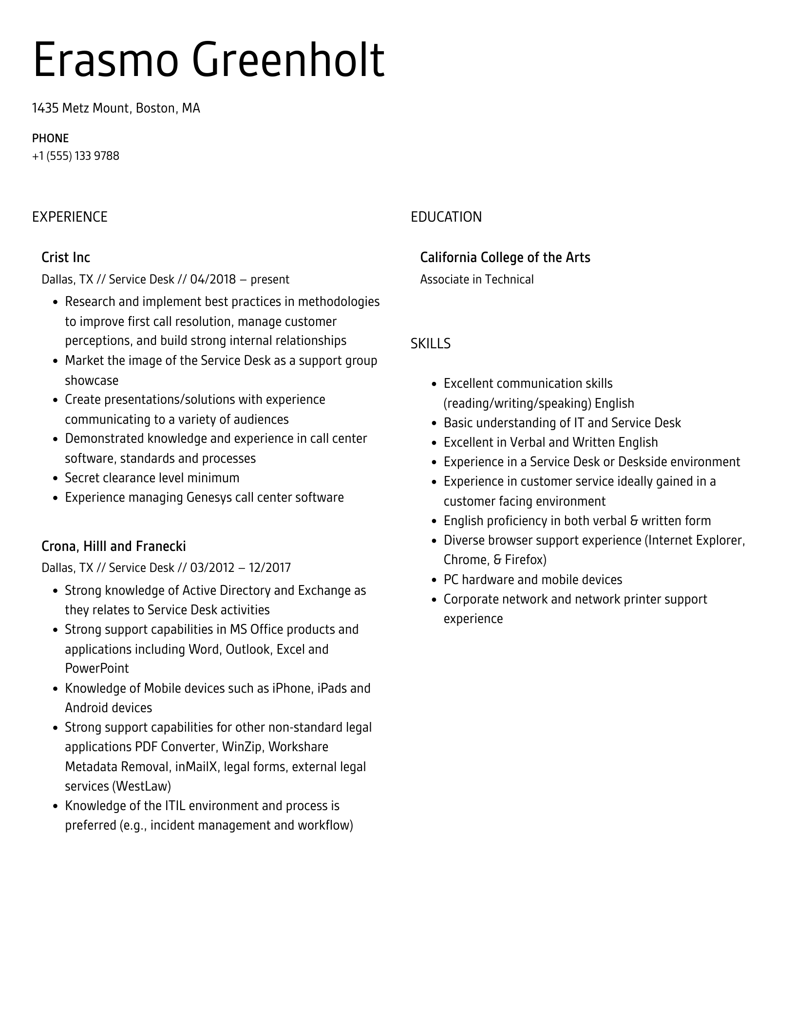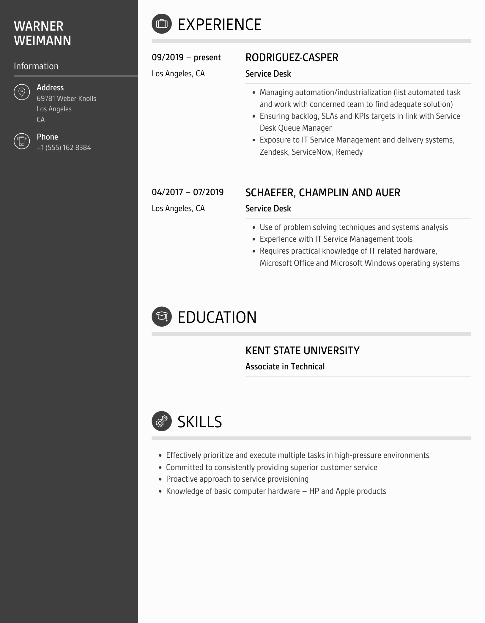 Guide the recruiter to the conclusion that you are the best candidate for the service desk job. It’s actually very simple. Tailor your resume by picking relevant responsibilities from the examples below and then add your accomplishments. This way, you can position yourself in the best way to get hired.