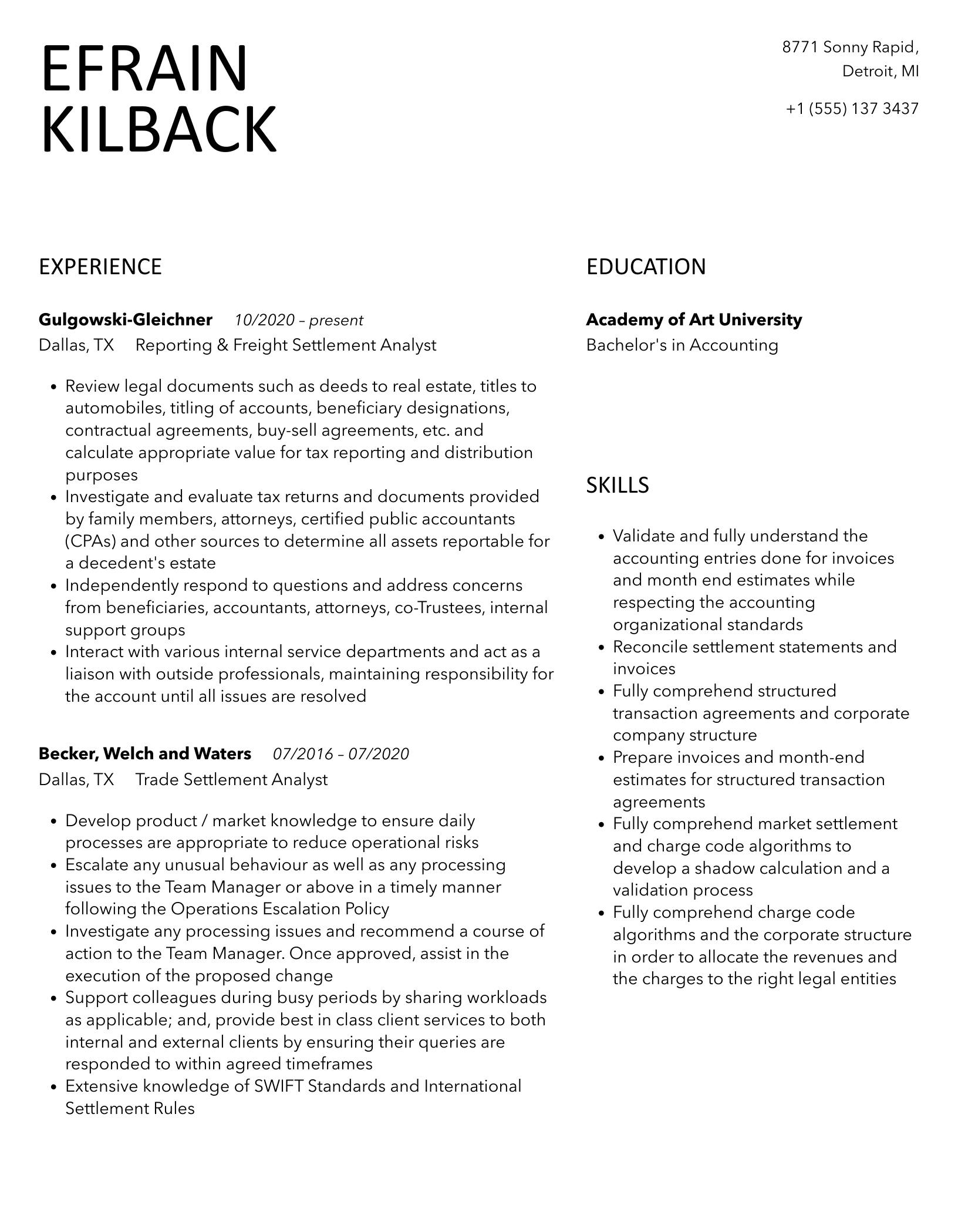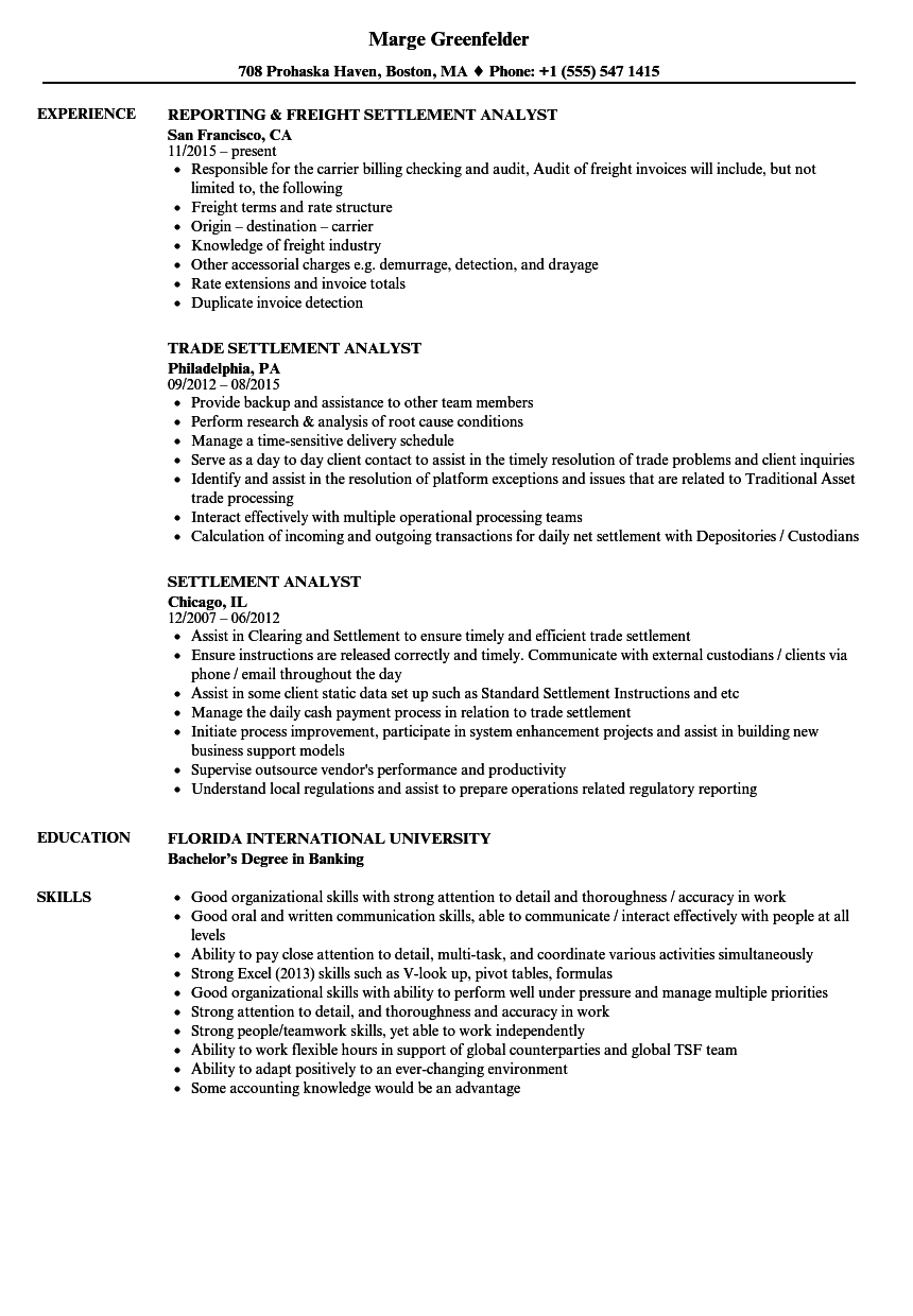 Guide the recruiter to the conclusion that you are the best candidate for the settlement analyst job. It’s actually very simple. Tailor your resume by picking relevant responsibilities from the examples below and then add your accomplishments. This way, you can position yourself in the best way to get hired.
