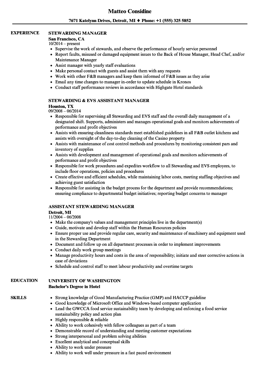 Guide the recruiter to the conclusion that you are the best candidate for the stewarding manager job. It’s actually very simple. Tailor your resume by picking relevant responsibilities from the examples below and then add your accomplishments. This way, you can position yourself in the best way to get hired.