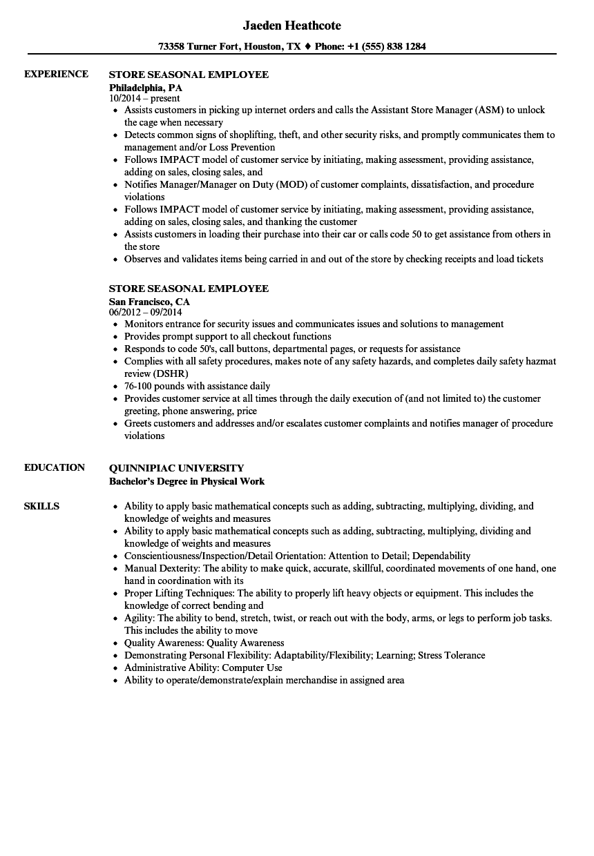 Guide the recruiter to the conclusion that you are the best candidate for the store seasonal employee job. It’s actually very simple. Tailor your resume by picking relevant responsibilities from the examples below and then add your accomplishments. This way, you can position yourself in the best way to get hired.