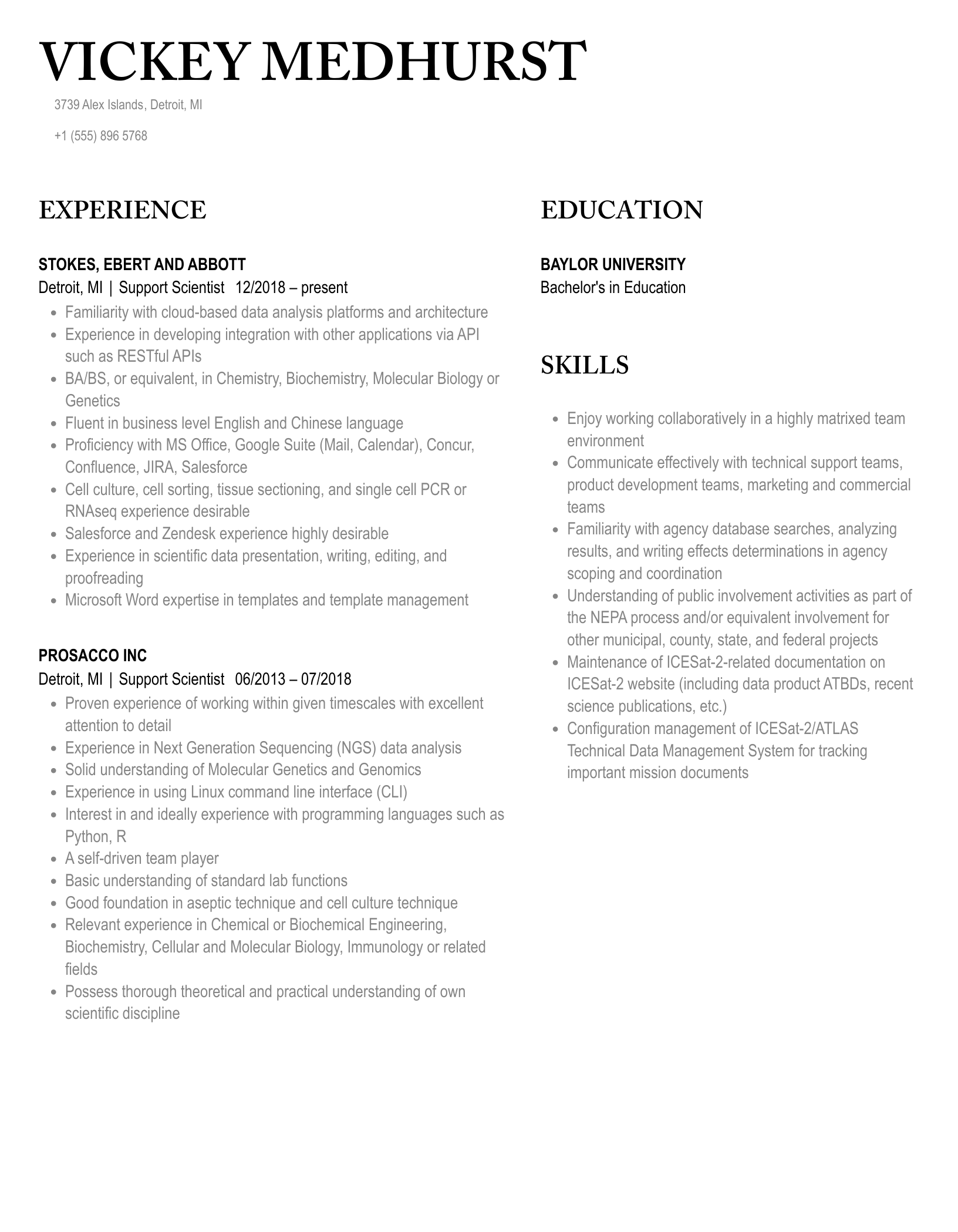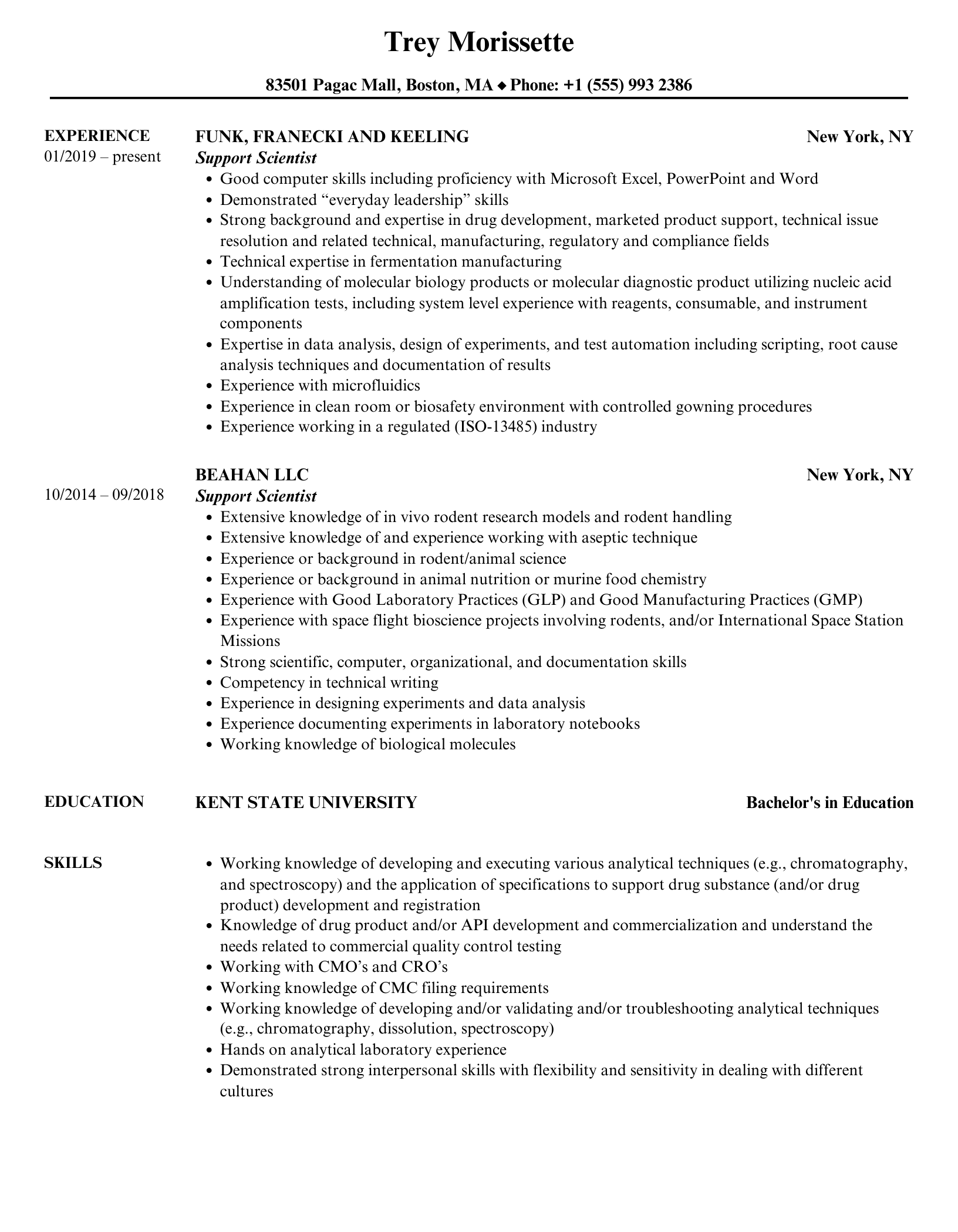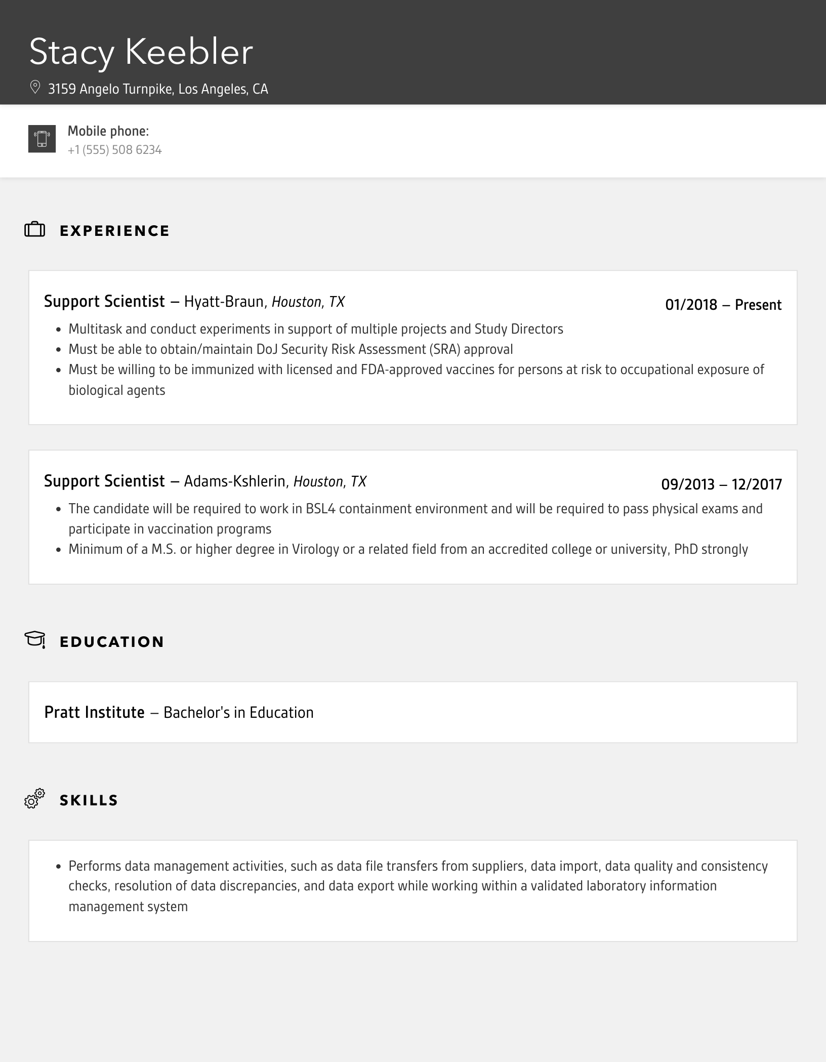 Guide the recruiter to the conclusion that you are the best candidate for the support scientist job. It’s actually very simple. Tailor your resume by picking relevant responsibilities from the examples below and then add your accomplishments. This way, you can position yourself in the best way to get hired.